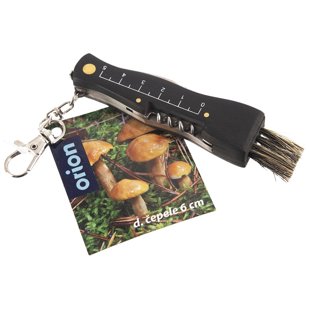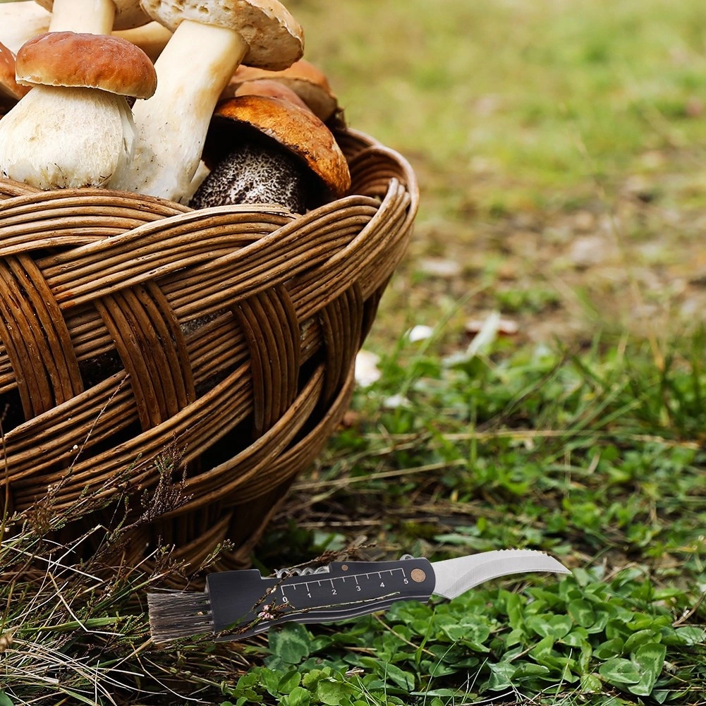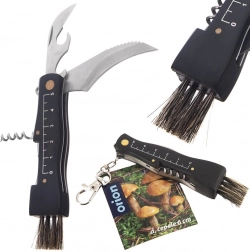 Praktický houbařský nůž se skládacím ostřím z nerezové oceli a černou dřevěnou rukojetí nabízí integrovaný kartáček, měřítko 1–5 cm, otvírák na lahve i vývrtku. Kompaktní rozměry po složení 11,5 × 2,5 × 1,5 cm z něj dělají ideálního společníka na sběr a čištění hub i výlety do přírody.