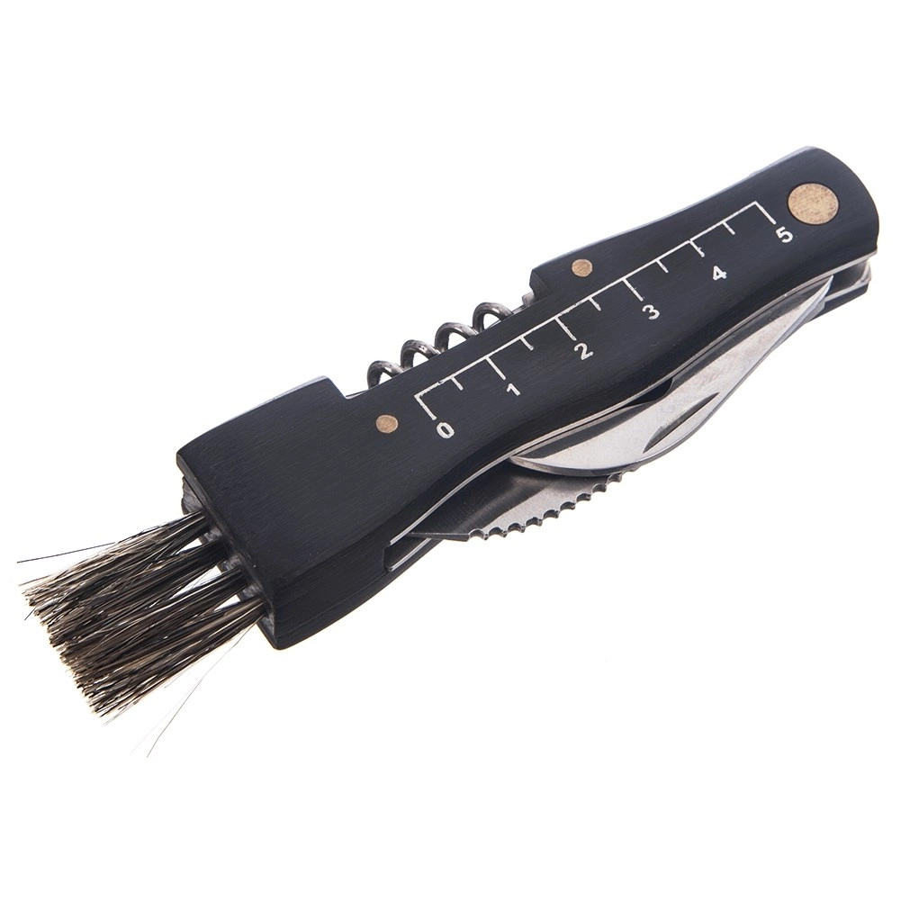 - Skládací čepel, kartáček na čištění hub, měřítko 1–5 cm, otvírák na lahve, vývrtka
