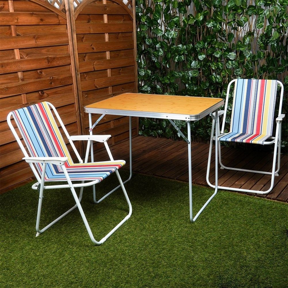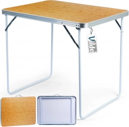 Praktický skládací kempingový stůl s deskou 80 × 60 cm a výškou 70,5 cm. Nabízí pevnou konstrukci z kovu a MDF s dřevodekorem, nosnost až 30 kg, je voděodolný a snadno se přenáší díky integrované rukojeti.
