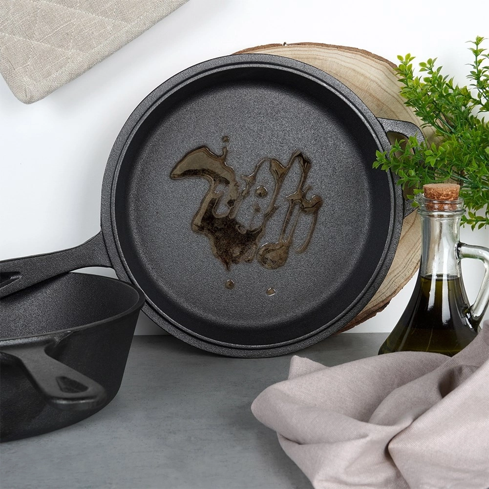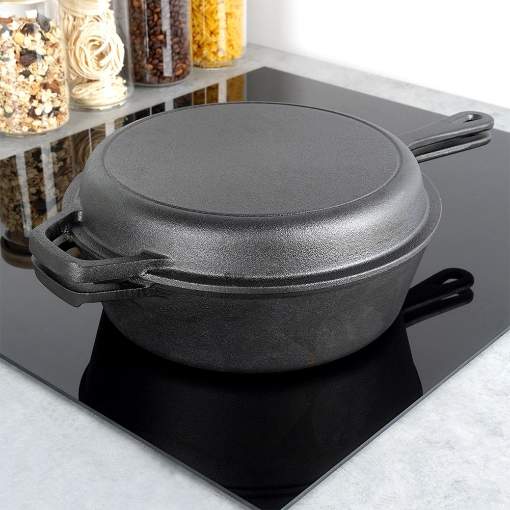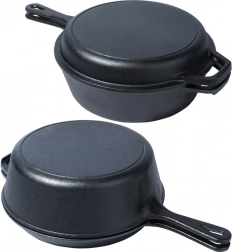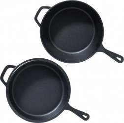 Robustní set z litiny pro univerzální vaření: hluboký hrnec a mělká pánev, které spolu dokonale ladí – pánev může sloužit jako poklice. Litina zajišťuje rovnoměrné rozložení tepla, dlouhou akumulaci a je ideální pro smažení, pečení i dušení na sporáku, v troubě i nad ohněm. Odolná konstrukce s dvojitými úchyty a kompatibilita s plynem, elektřinou, sklokeramikou i indukcí dělá z tohoto setu spolehlivého parťáka do každé kuchyně i na kempování.