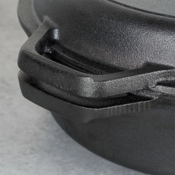 Nádobí je vhodné pro sporák, troubu, gril i otevřený oheň. Praktické dlouhé i pomocné úchyty usnadňují manipulaci a otvor v rukojeti umožní zavěšení. Správnou péčí (ruční mytí, důkladné vysušení a lehké naolejování) si litina zachová dlouhou životnost.