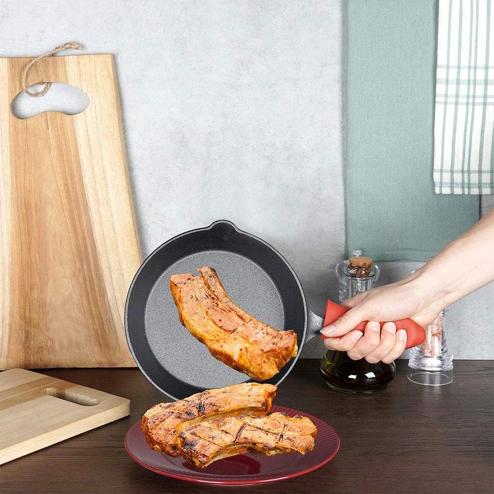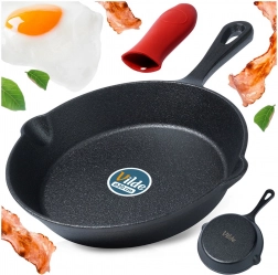 Tato kompaktní litinová pánev 20 cm je ideální pro smažení, restování, pečení i servírování příloh. Masivní litinové tělo se rychle a rovnoměrně zahřívá a dlouho drží teplotu, takže jídlo zůstane déle teplé a šťavnaté. Dvě praktické výlevky usnadní slévání omáček či tuku a červený silikonový návlek zvyšuje bezpečnost při manipulaci.