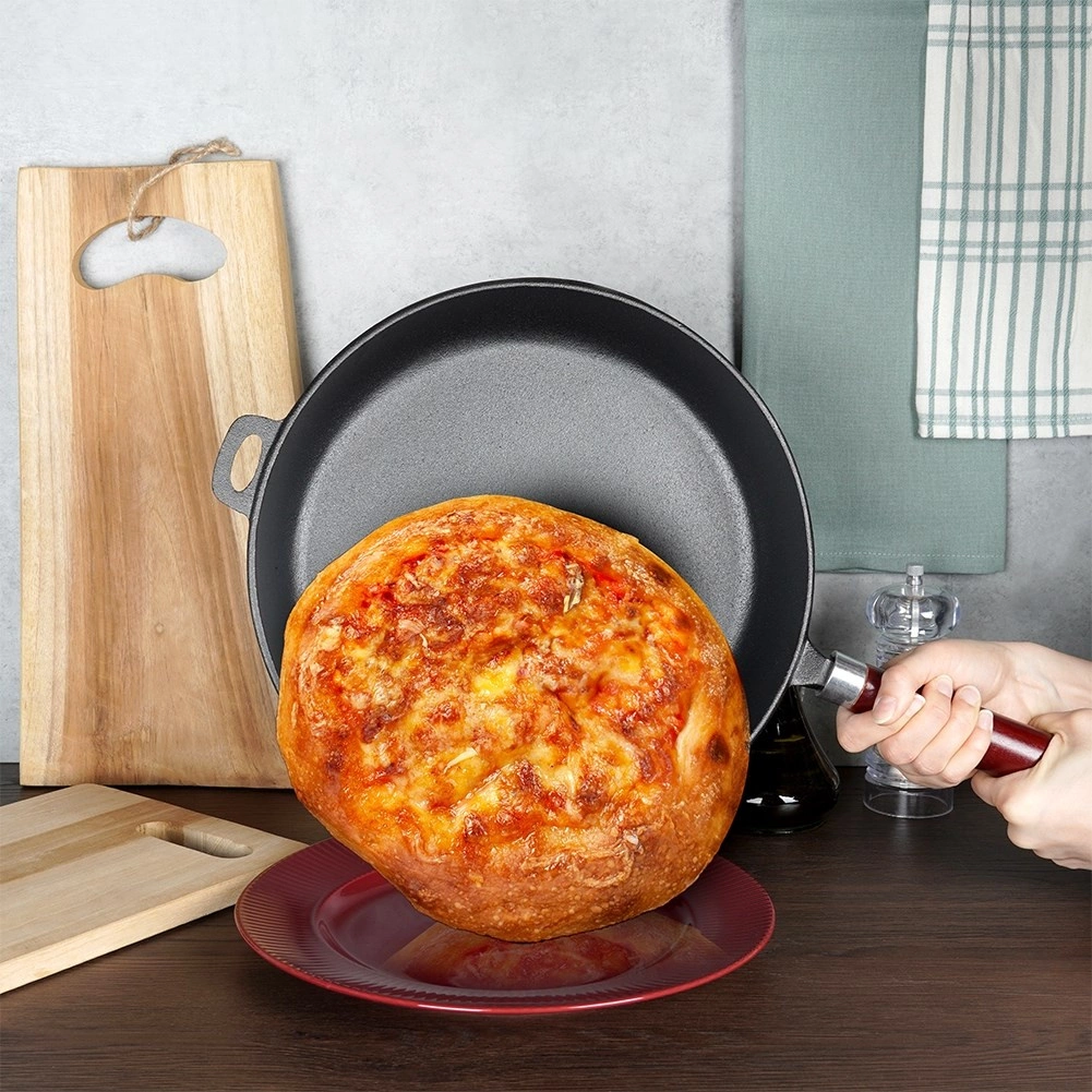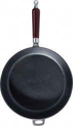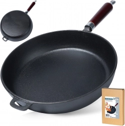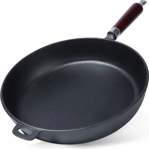 Praktická dřevěná rukojeť poskytuje jistý úchop, pomocné ucho usnadňuje manipulaci a zavěšení. Pánev lze používat na všech typech sporáků včetně indukce a také na grilu či otevřeném ohni. Po odšroubování rukojeti je vhodná i do trouby. Bez nepřilnavých povlaků – čisté litinové nádobí pro přirozené výsledky vaření.