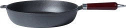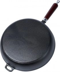 Univerzální litinová pánev o průměru 30 cm pro každodenní vaření doma i venku. Díky masivnímu tělu skvěle vede a udržuje teplo, má hluboké stěny, ergonomickou dřevěnou rukojeť a pomocné ouško pro bezpečné přenášení. Vhodná na indukci, plyn, elektriku, sklokeramiku, halogen i do trouby po sejmutí rukojeti.
