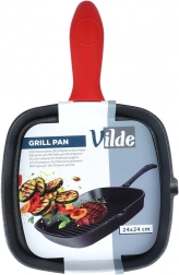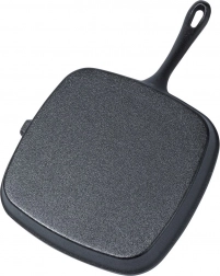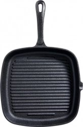Čtvercová litinová grilovací pánev s praktickou červenou silikonovou návlekovou rukojetí pro bezpečné přenášení. Nabízí rychlé a rovnoměrné zahřívání, vysokou akumulaci tepla a žebrovaný povrch pro autentické mřížky a odvod tuku. Vhodná na plyn, elektřinu, keramiku, halogen i indukci, do trouby i na otevřený oheň či gril.