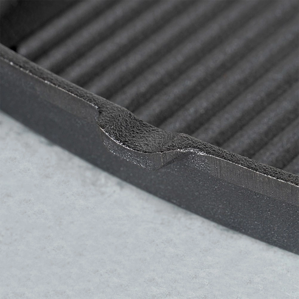 Vyšší žebra vytvářejí výrazné grilovací pruhy a odvádějí tuk. Integrované výlevky usnadní slití šťáv a omastku.
