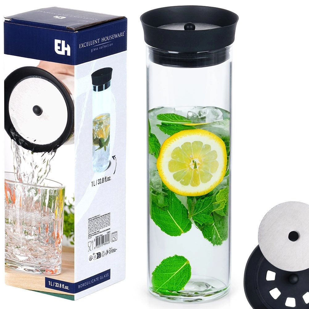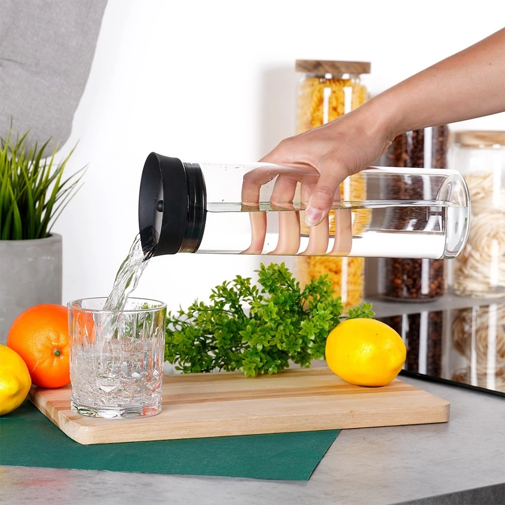 Tato univerzální karafa je vyrobena z čirého borosilikátového skla, které vyniká odolností a elegantním vzhledem. Víčko z kombinace silikonu a nerezové oceli zajišťuje čisté nalévání bez odkapávání a současně chrání nápoj před nečistotami a hmyzem.