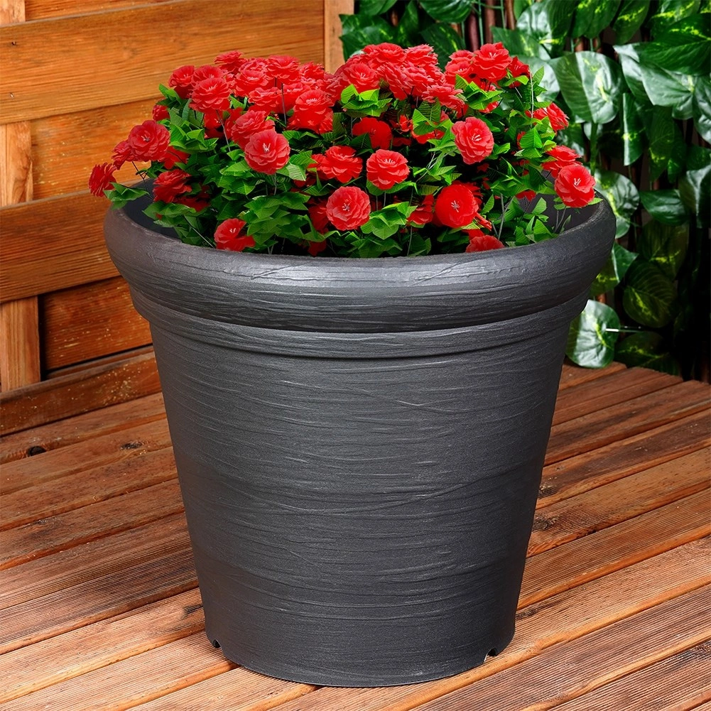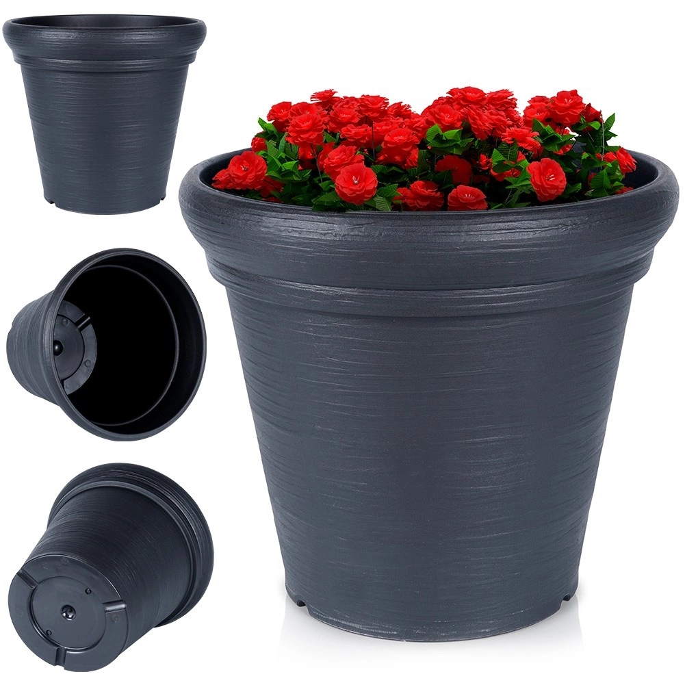 Stylový plastový květináč v černé barvě pro venkovní i celoroční použití. Nabízí odolnost vůči povětrnosti, nízkou hmotnost, elegantní strukturovaný povrch a praktické rozměry 38 × 34 cm pro květiny, bylinky i okrasné dřeviny.