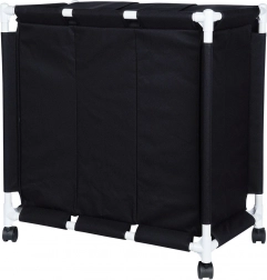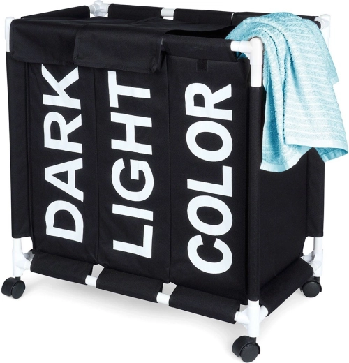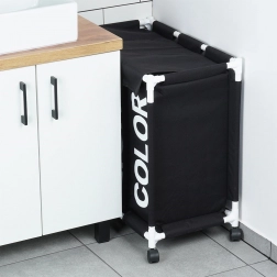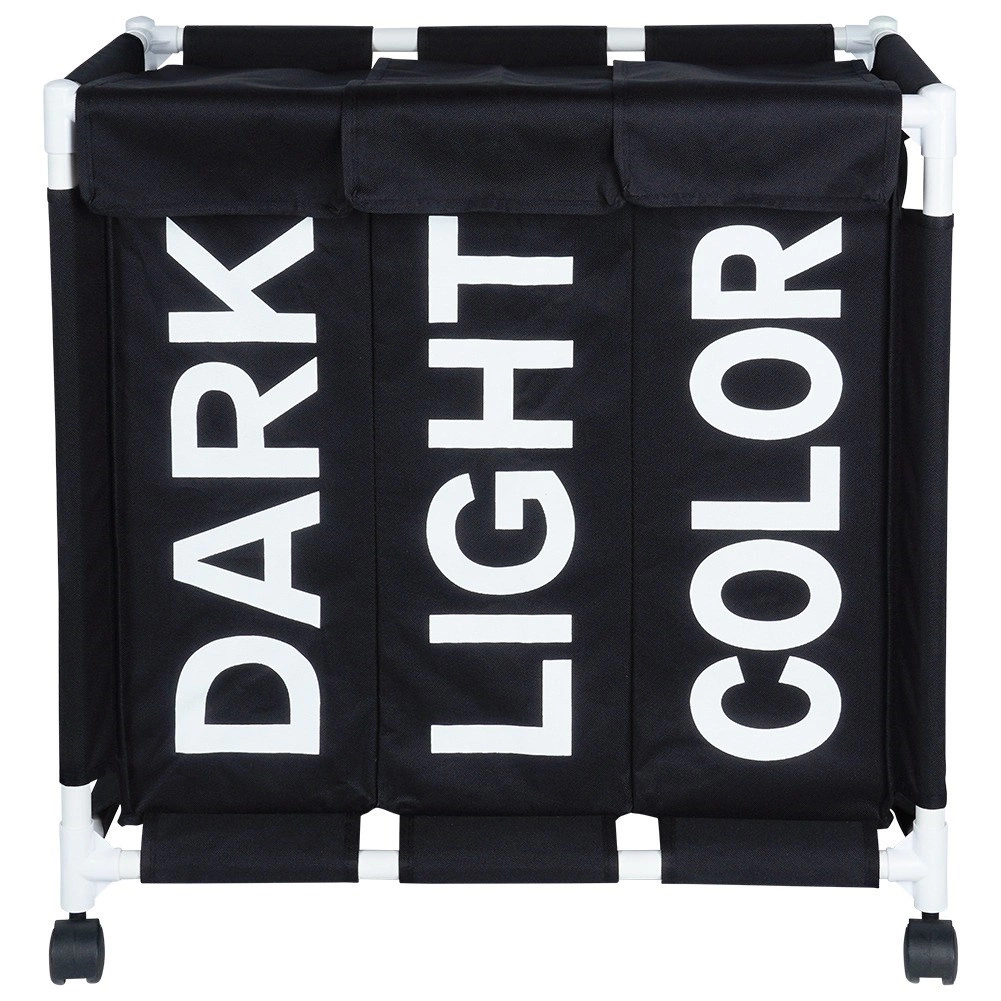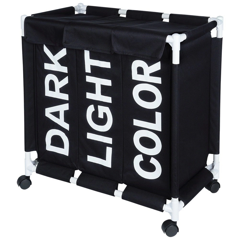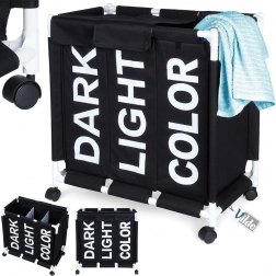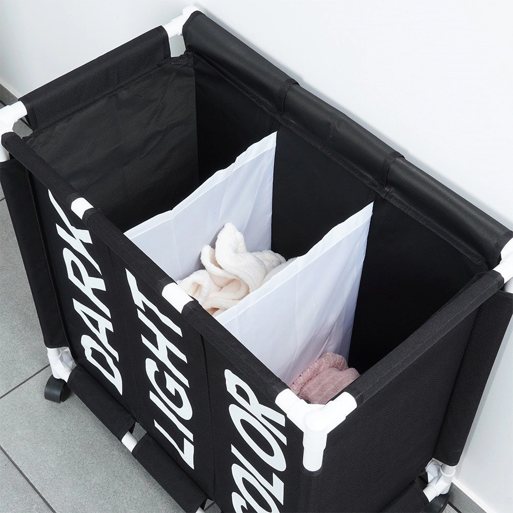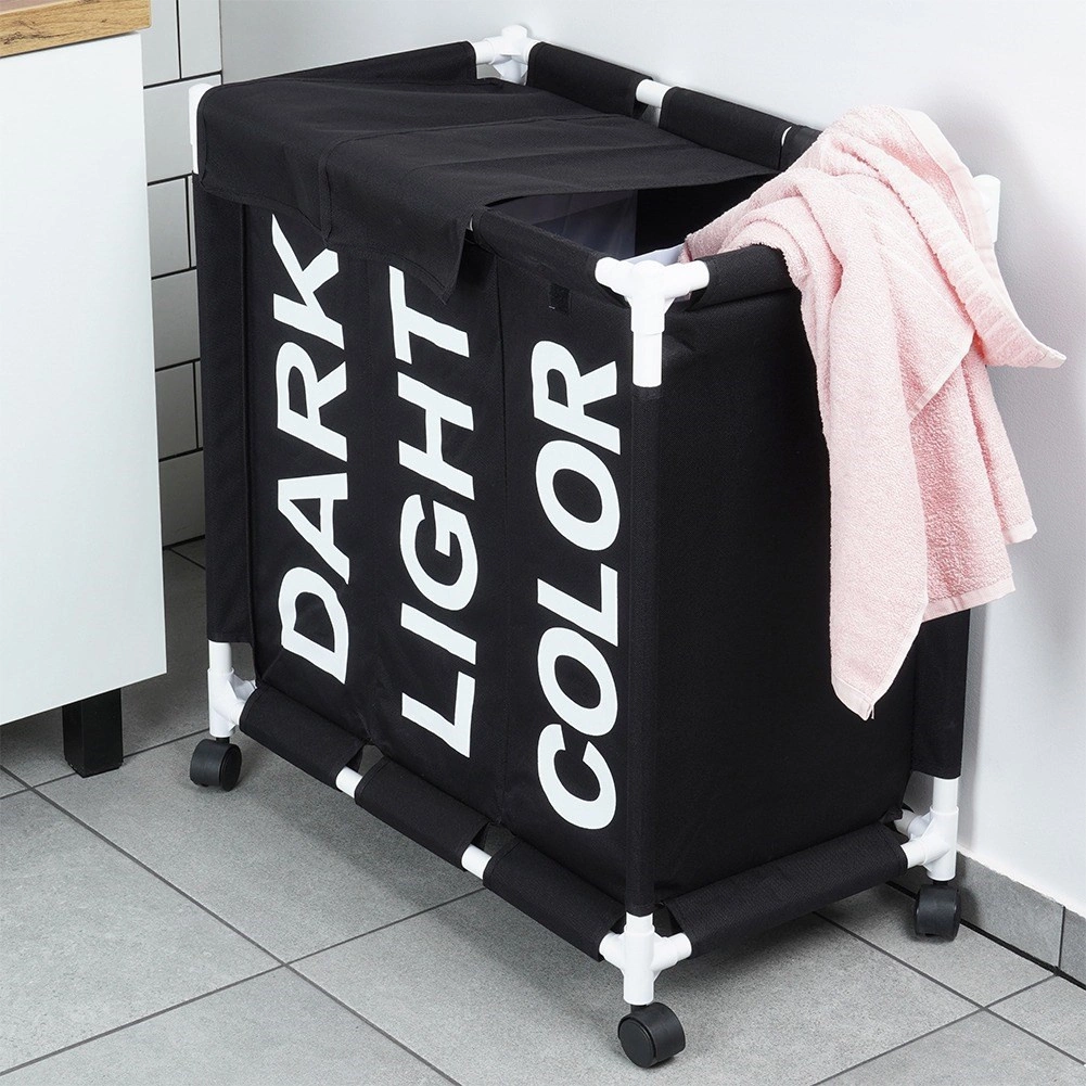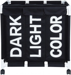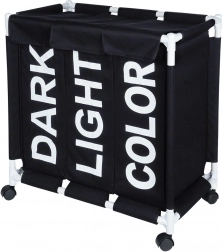 Praktický tříkomorový prádelní koš na kolečkách s objemem 137 l usnadní třídění prádla na dark, light a color. Lehký, ale stabilní rám z odolného plastu, pevné polyesterové vaky a 4 otočná kolečka pro snadné přesouvání z pokoje do koupelny či prádelny. Každá komora má samostatné víko na suchý zip, které pomáhá omezit pachy a udržet pořádek.