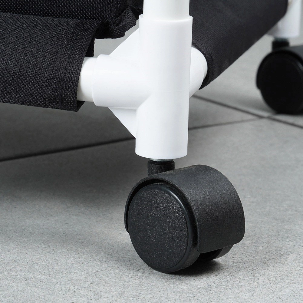 Bílý plastový rám s pevnými spojkami a černé polyesterové vaky drží tvar i při vyšší zátěži. Praktické provedení do koupelny, ložnice i šatny.