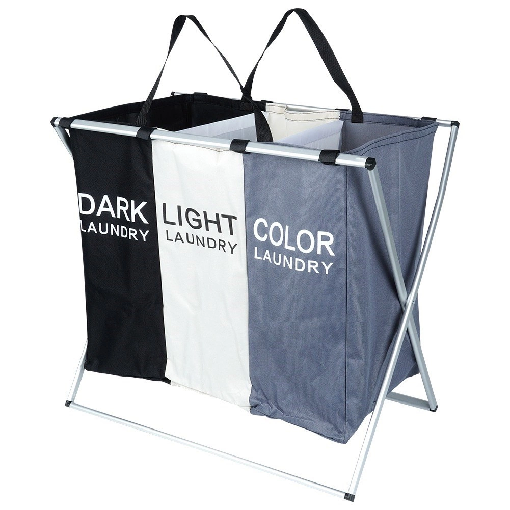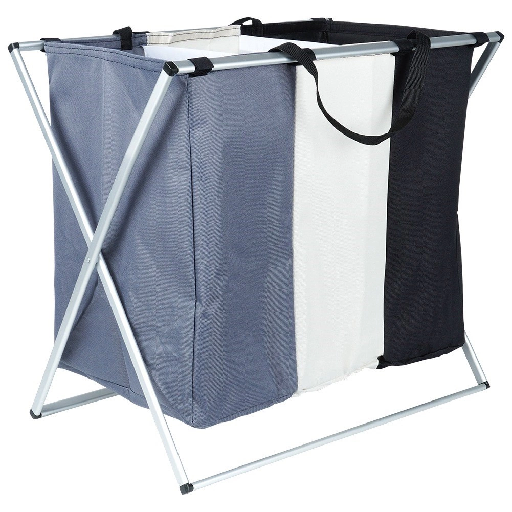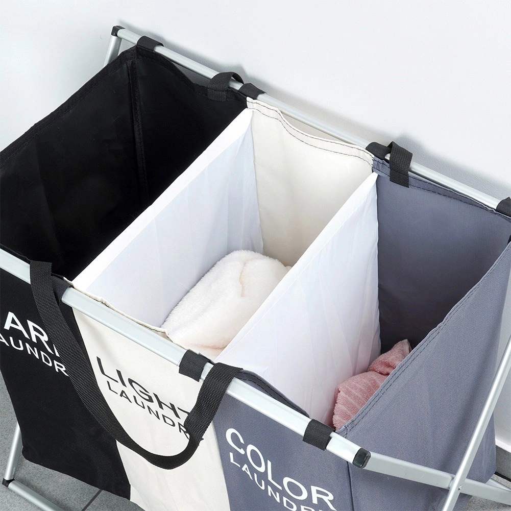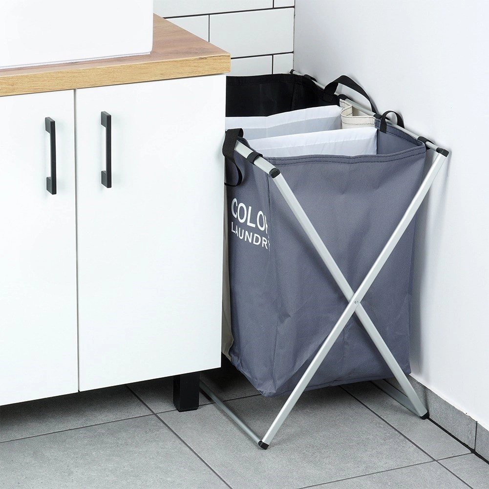 Udržujte pořádek v prádle s přehledným tříkomorovým košem, který umožňuje okamžité třídění na tmavé, světlé a barevné. Lehký, ale stabilní kovový rám ve stříbrné barvě a pevné textilní vaky zajišťují dlouhou životnost a pohodlné používání každý den.