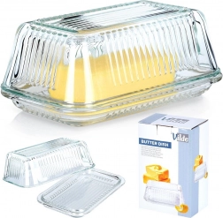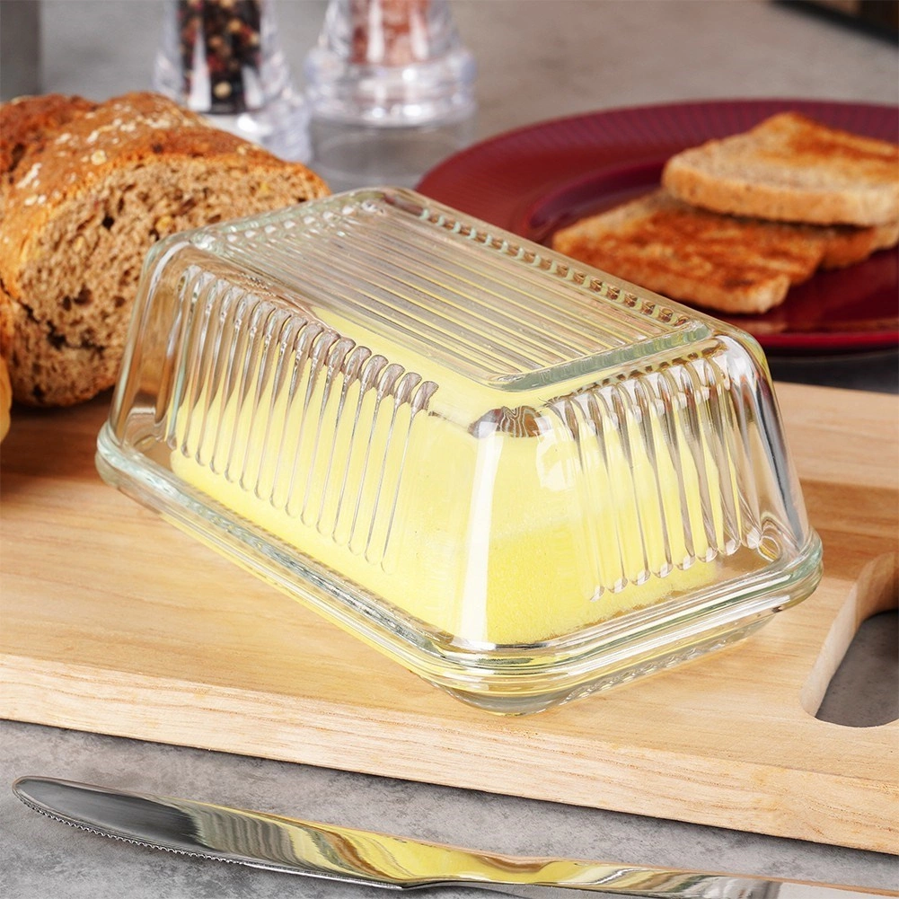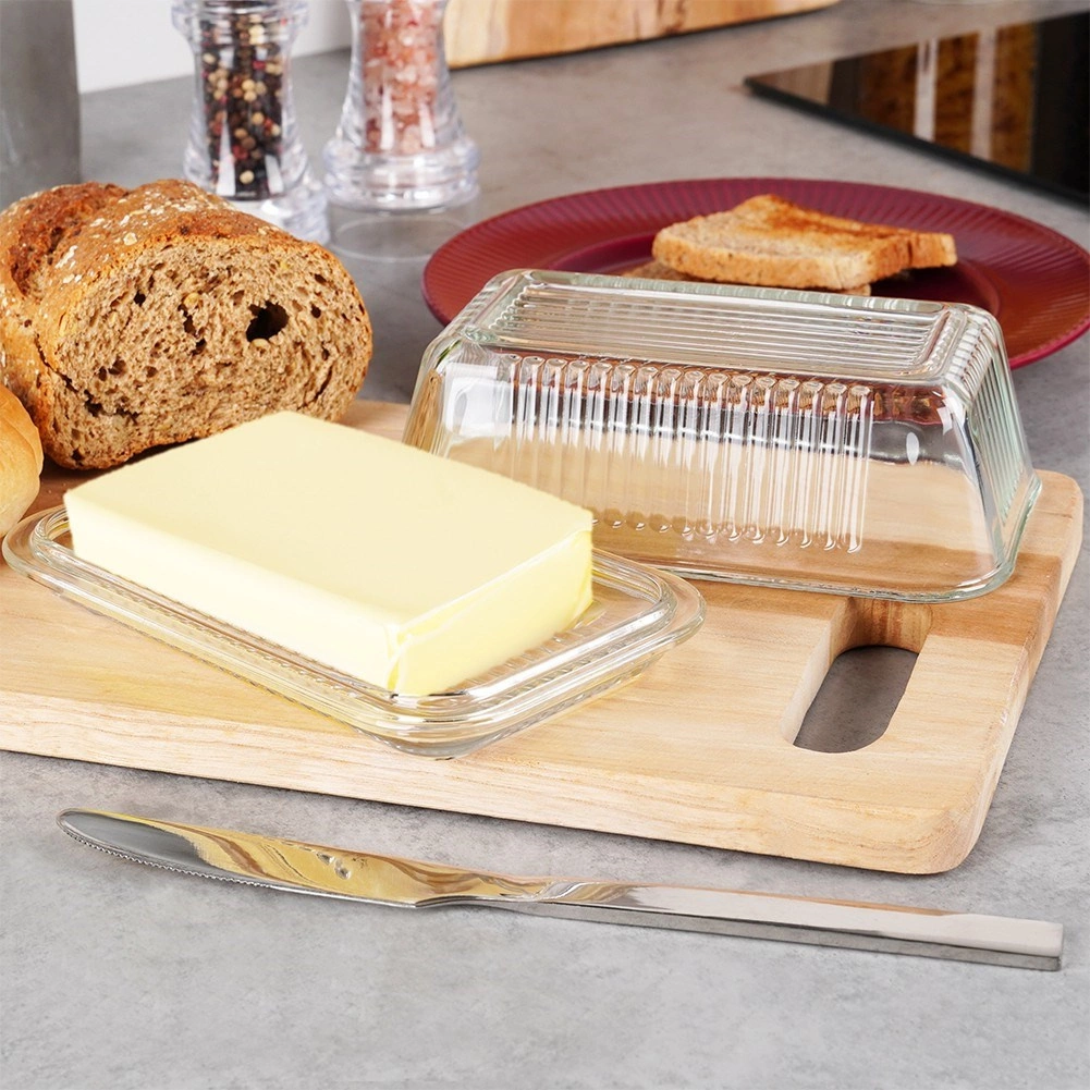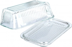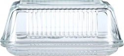 Skleněná máslenka Vilde je stylový a praktický doplněk do každé kuchyně. Čiré, kvalitní sklo s dekorativním žebrováním podtrhuje elegantní vzhled a zároveň usnadňuje úchop. Klasický obdélníkový tvar skvěle padne k jakékoli stolní soupravě a umožňuje pohodlné servírování másla na stůl i jeho přehledné uložení v lednici.