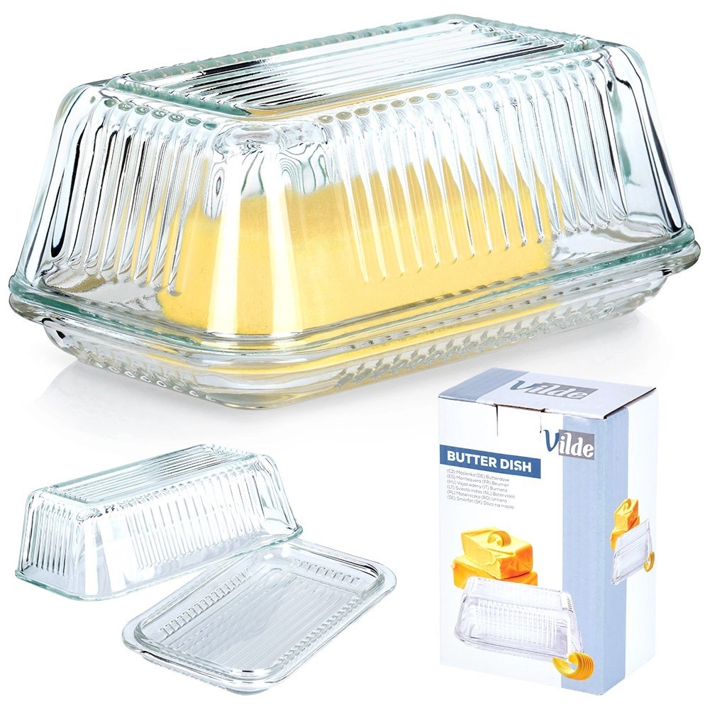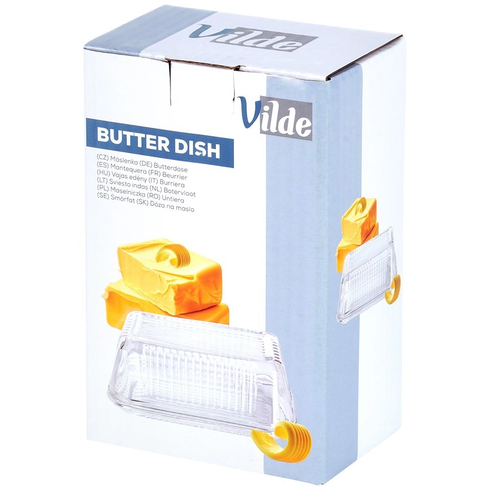 Elegantní skleněná máslenka Vilde s klasickým tvarem a žebrovaným designem udrží máslo čerstvé a krásně servírované. Je vyrobena z kvalitního, silného čirého skla, má praktické víčko pro ochranu před pachy a nečistotami a díky průhlednému materiálu snadno vidíte zbývající množství. Vhodná do myčky nádobí.