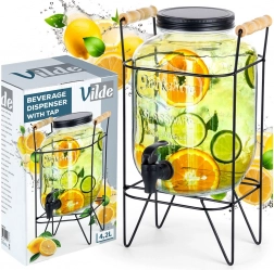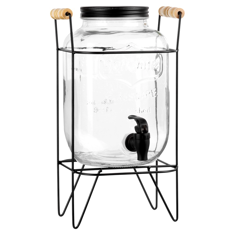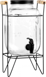 Stylový skleněný dávkovač nápojů o objemu 4,2 l s praktickým kohoutkem a stabilním kovovým stojanem v černé barvě. Ideální pro servírování limonád, džusů, ledového čaje či punče na zahradní party i doma. Má šroubovací víčko, reliéfní zdobení a pohodlné nalévání díky zvýšené poloze na stojanu.