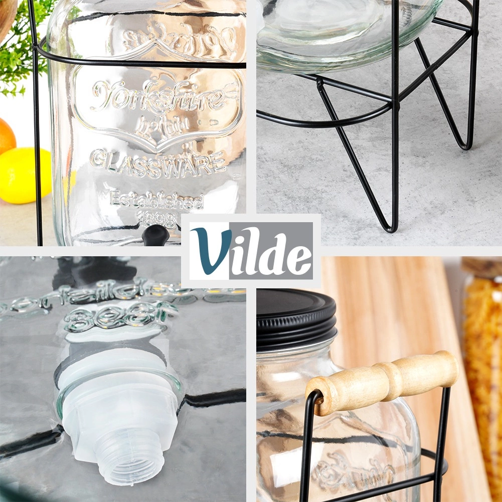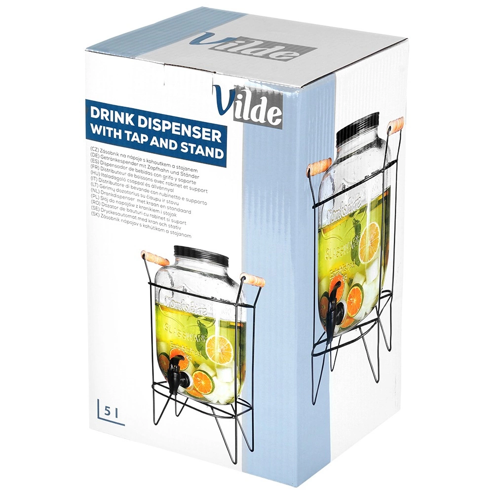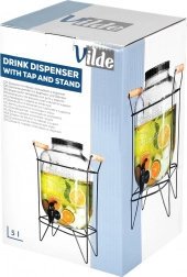 Elegantní dávkovač z kvalitního silného skla se vyjímá na každém stole a usnadní obsluhu hostů. Vyvýšený stojan z matného kovu se dřevěnými madly poskytuje prostor pro sklenice pod kohoutkem a zajišťuje stabilitu. Černé šroubovací víčko chrání nápoj před hmyzem a nečistotami.