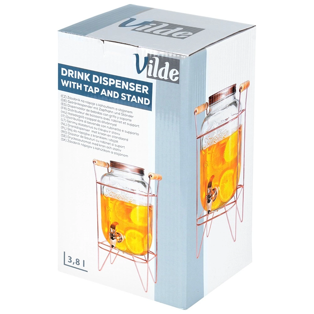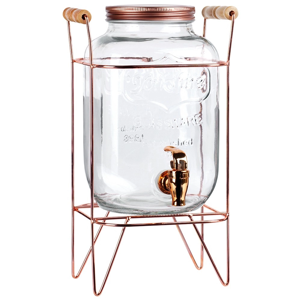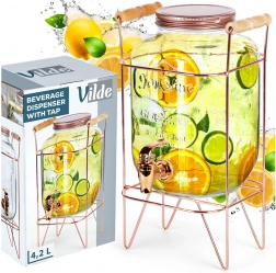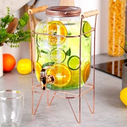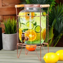 Elegantní skleněný dávkovač na nápoje o objemu 4,2 l se stabilním stojanem v barvě růžového zlata a praktickým kohoutkem pro snadné servírování. Ideální na limonády, ponče, ovocné vody i ledové čaje během oslav, grilování a rodinných setkání. Široké hrdlo usnadní přidání ledu a ovoce, šroubovací víčko chrání nápoj před hmyzem.