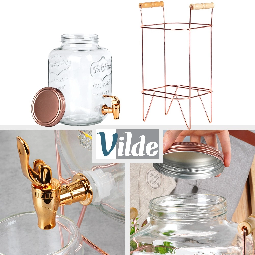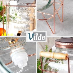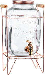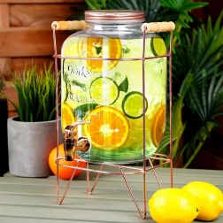 Tento stylový dispensér na nápoje kombinuje odolné silnostěnné sklo s pevnou kovovou konstrukcí stojanu v odstínu růžového zlata a dřevěnými madly pro snadné přenášení. Praktický kohoutek umožní plynulé nalévání bez rozlévání, zatímco šroubovací víčko udrží obsah čistý a chráněný. Skvělé řešení pro zahradní párty, rodinné oslavy i catering.