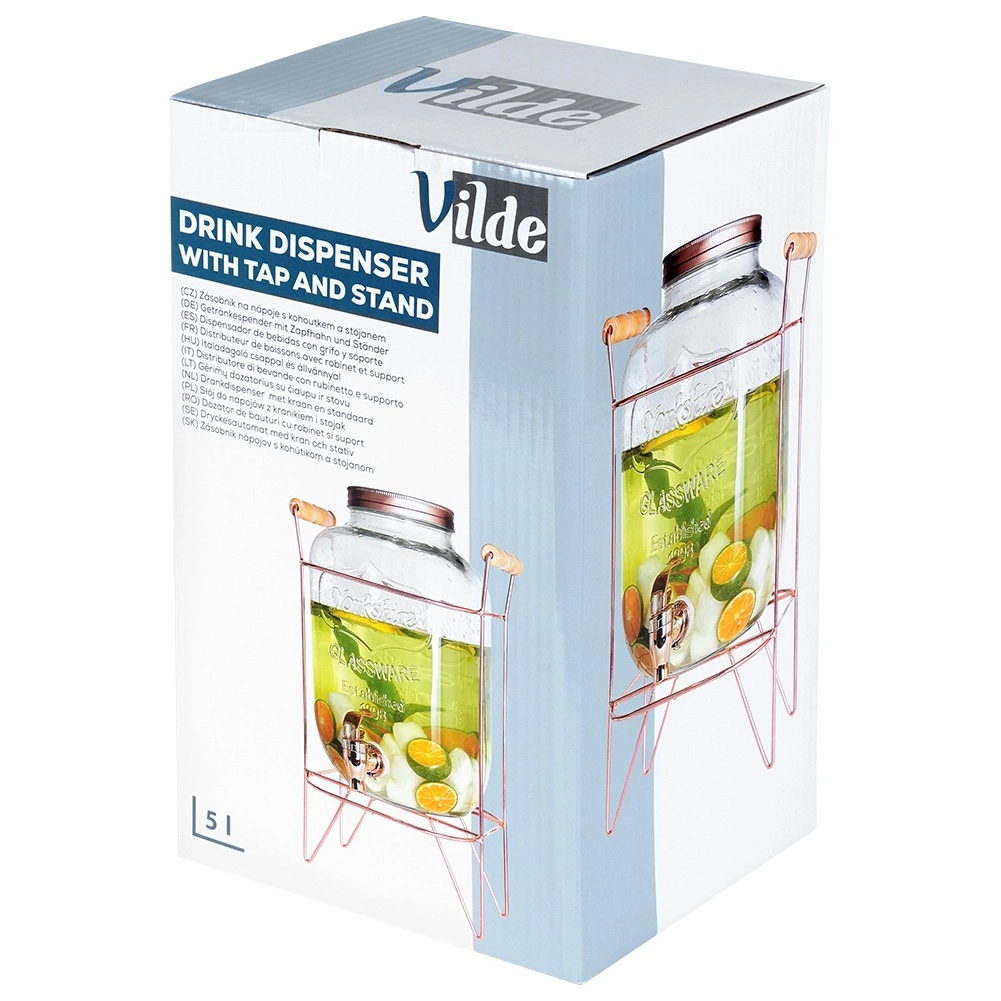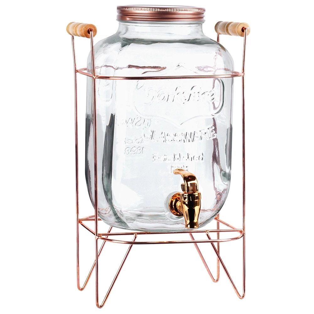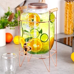 Elegantní skleněný nápojový dispensér o objemu 5,5 l na pevném kovovém stojanu v barvě růžového zlata je ideální pro limonády, vodu, ledový čaj i punč. Díky kohoutku s těsněním nalévá pohodlně a čistě, šroubovací víko chrání nápoj před hmyzem a průhledné, silné sklo s reliéfem stylově ukáže ovoce a led.