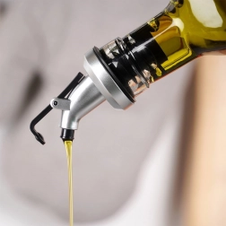 Výklopné hrdlo s těsnící vložkou zpomaluje průtok, brání odkapávání a umožňuje přesně dávkovat olej či ocet bez nepořádku.