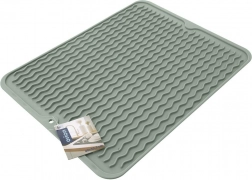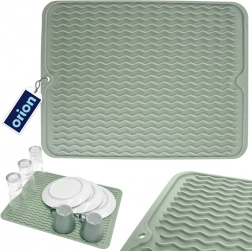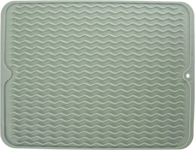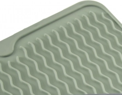 Praktická silikonová odkapávací podložka v zelené barvě o rozměrech 40 × 30,5 cm urychlí sušení nádobí díky profilovaným vlnkovým drážkám. Je flexibilní, neklouzavá, snadno se čistí a šetří místo na kuchyňské lince. Skvěle poslouží pro taleře, sklenice, hrnky i příbory a lze ji mýt v myčce.