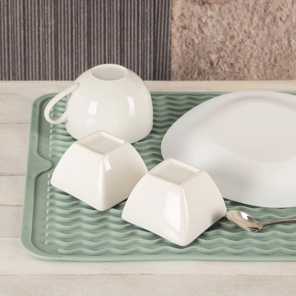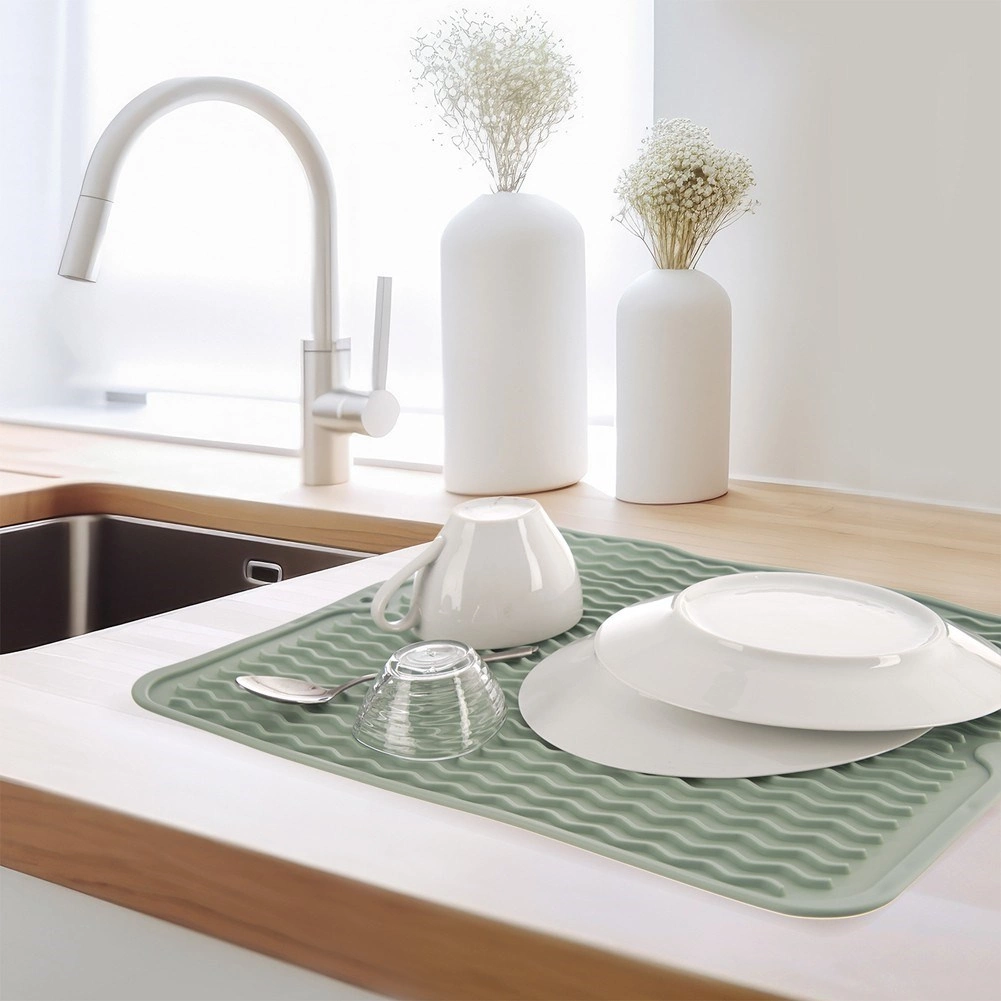 Tato odkapávací podložka ze silikonu je stylovou a prostorově úspornou alternativou ke klasické odkapávačce. Vysoké vlnité drážky zajišťují efektivní odvod vody jedním směrem a lepší cirkulaci vzduchu, takže nádobí schne rychleji a bez kaluží. Minimalistický design v jemné zelené barvě zapadne do každé kuchyně.