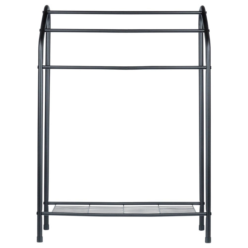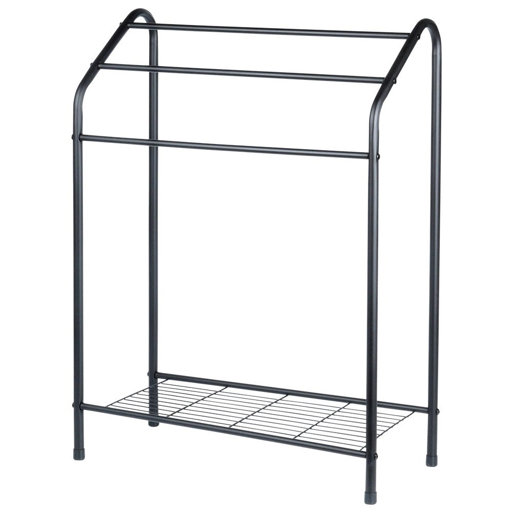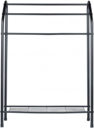 Tento volně stojící věšák na ručníky v industriálním loft stylu přináší pořádek a vzdušné sušení do každé koupelny. Tři vodorovné tyče umožní rozdělit ručníky podle velikosti nebo členů domácnosti a spodní drátěná police slouží k uložení složených ručníků či koupelnových doplňků.