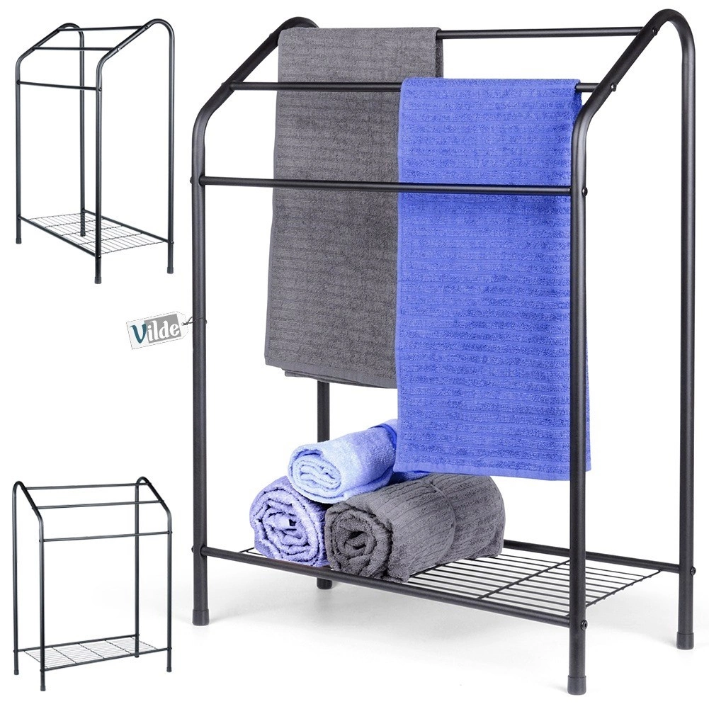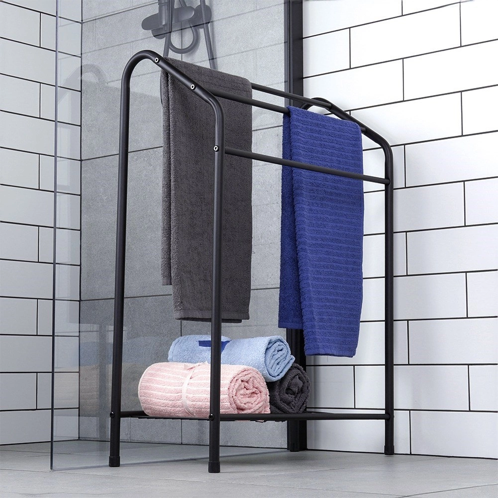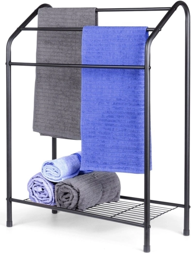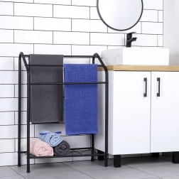 Elegantní stojanový věšák na ručníky s třemi příčkami a praktickou spodní policí nabízí dostatek prostoru pro sušení i organizaci. Odolná kovová konstrukce s černým práškovým lakem se hodí do moderních i klasických koupelen a díky stabilnímu provedení zajistí pohodlné používání každý den.