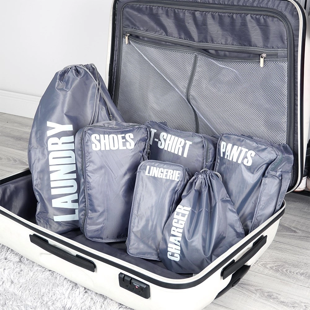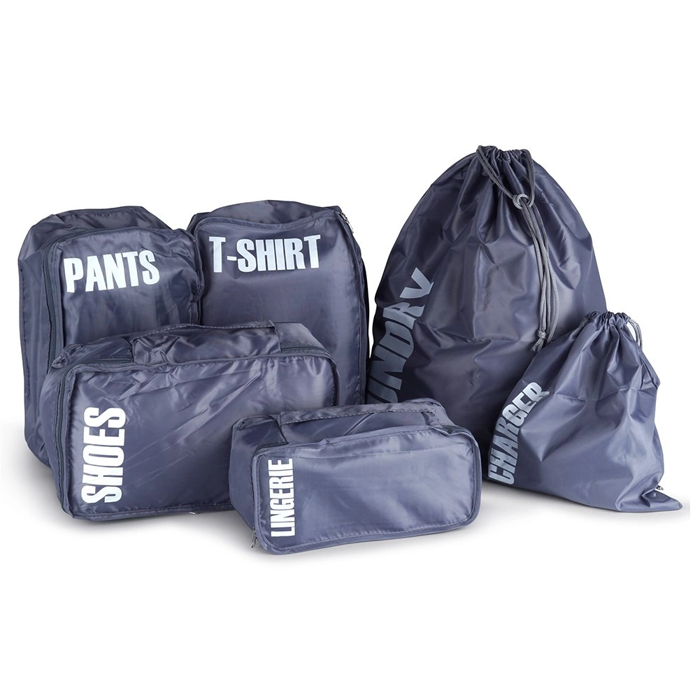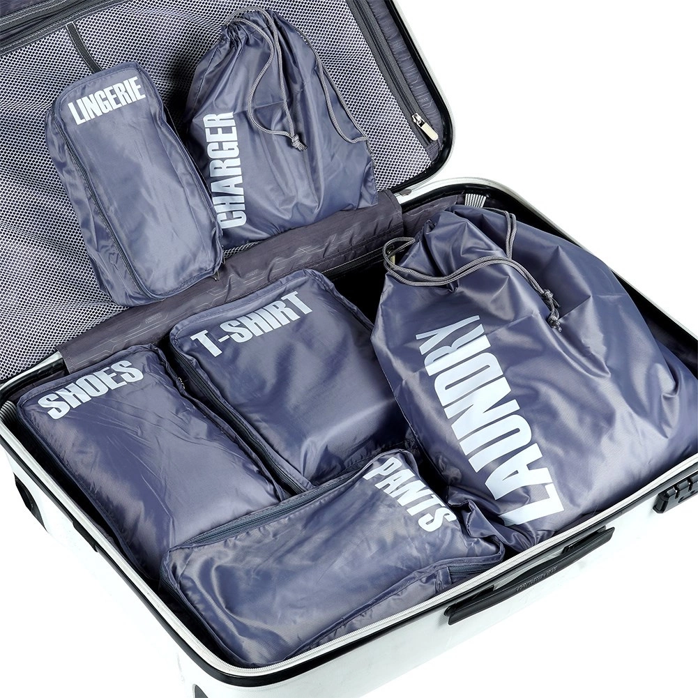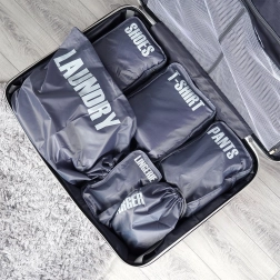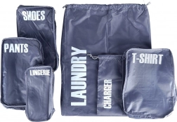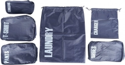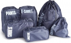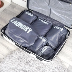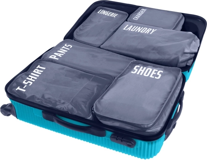 Praktická sada 6 cestovních organizérů do kufru pro dokonalý pořádek na cestách. Každé pouzdro je jasně označené (prádlo, nabíječky, kalhoty, boty, spodní prádlo, trička) pro rychlou orientaci. Lehké a odolné provedení z polyesteru, většina pouzder se zapíná na zip a umožňuje efektivní využití prostoru ve vašem zavazadle.