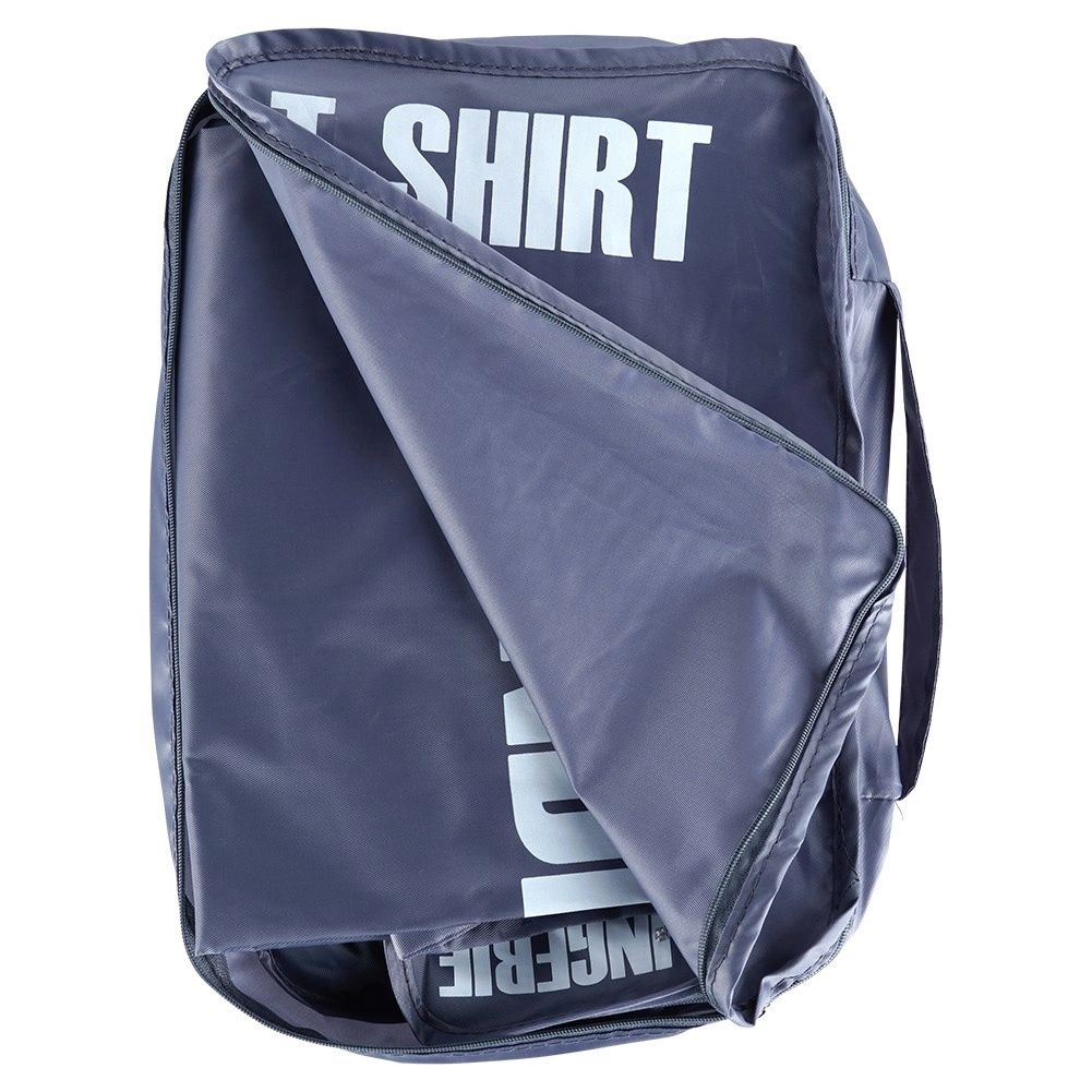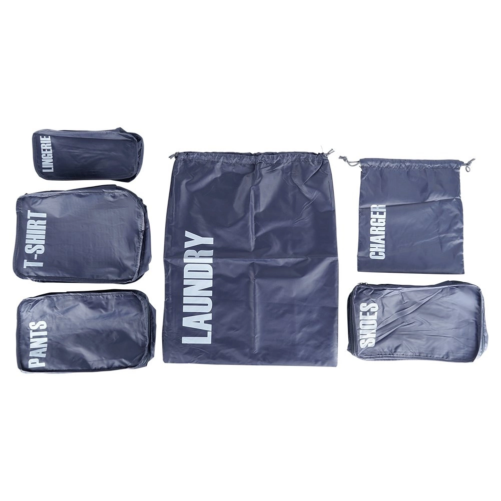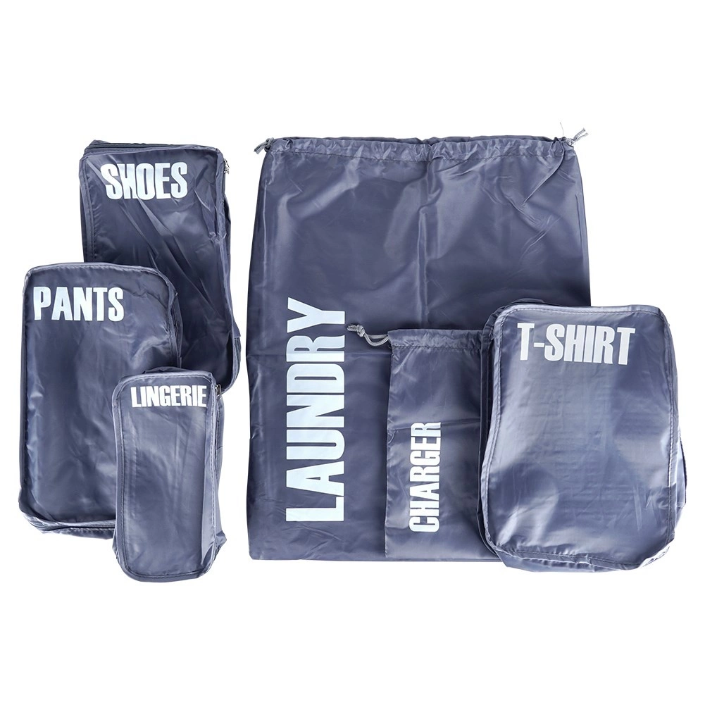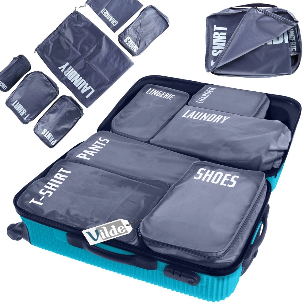 Praktická sada 6 cestovních organizérů do kufru pro dokonalý pořádek na cestách. Každé pouzdro je jasně označené (prádlo, nabíječky, kalhoty, boty, spodní prádlo, trička) pro rychlou orientaci. Lehké a odolné provedení z polyesteru, většina pouzder se zapíná na zip a umožňuje efektivní využití prostoru ve vašem zavazadle.