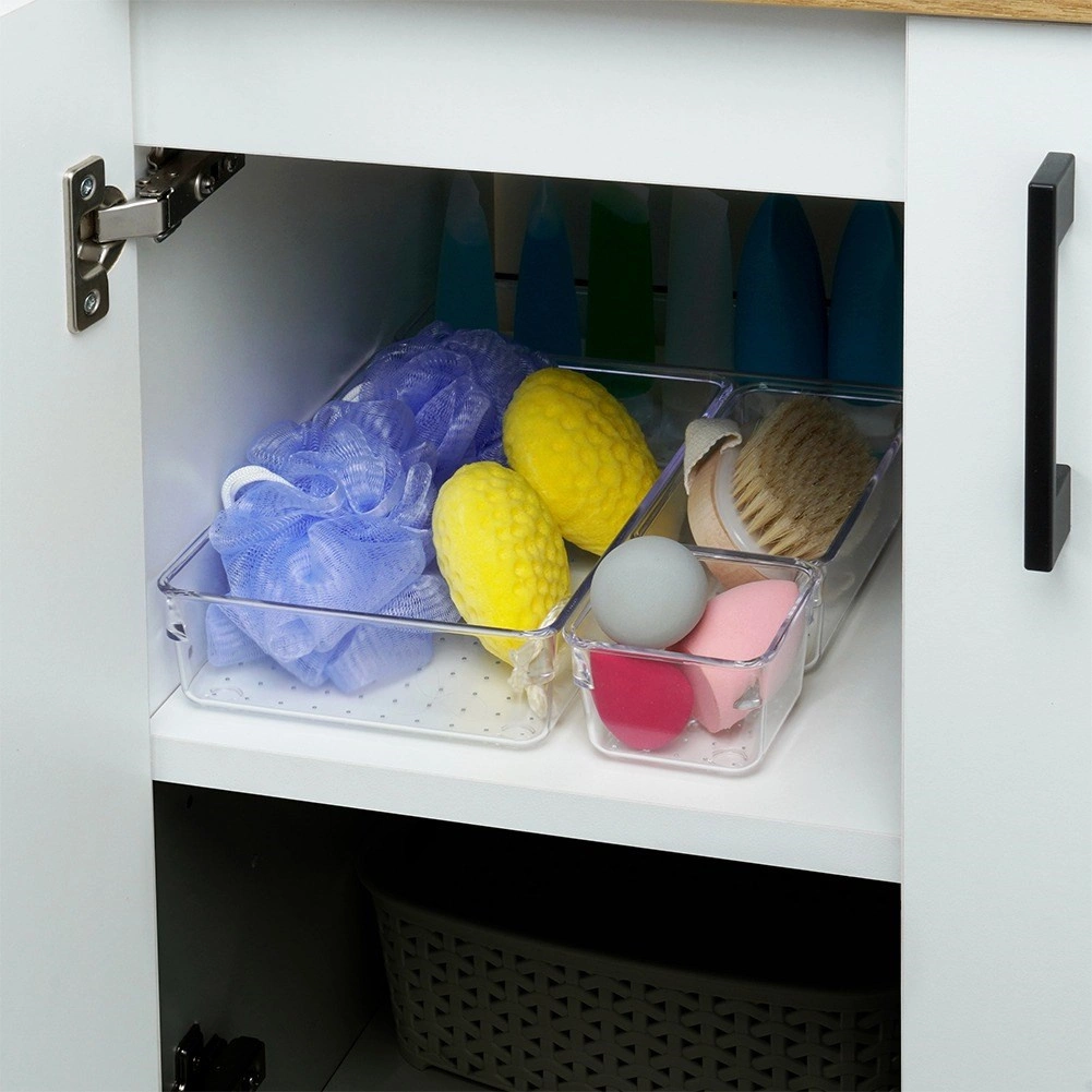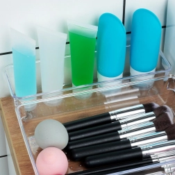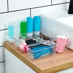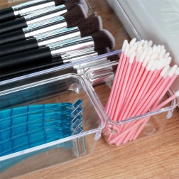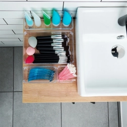Čtyři samostatné přihrádky v různých rozměrech snadno zkombinujete v zásuvce i na desce. Uspořádejte štětce, vatové tyčinky, doplňky i kosmetiku přesně podle svých potřeb.