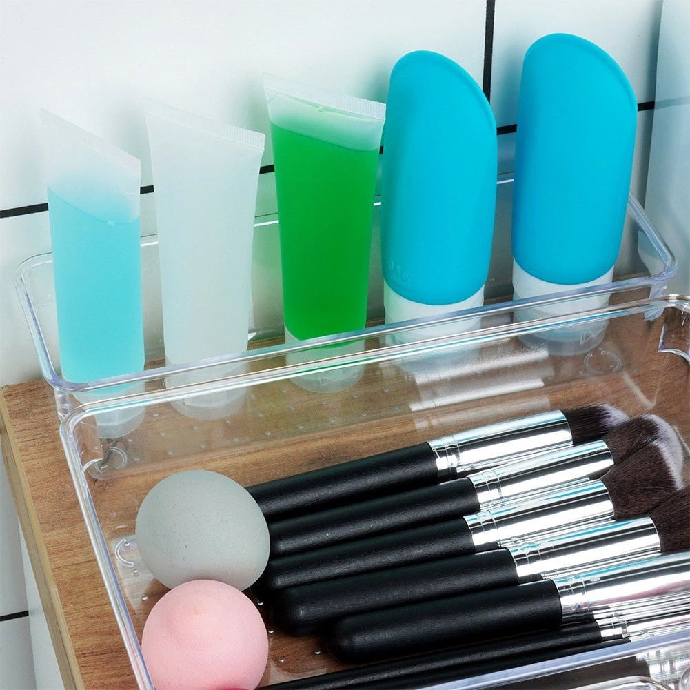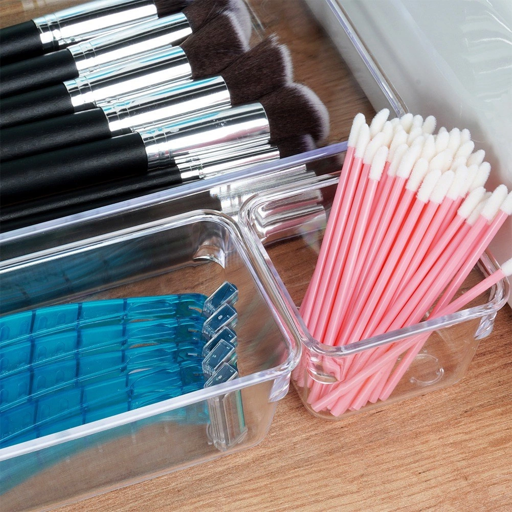 Praktická sada čtyř průhledných pořadačů z kvalitního akrylu přináší pořádek do koupelny, ložnice i šatny. Díky různým rozměrům zásobníků snadno oddělíte štětce, houbičky, vatové tyčinky, šperky nebo doplňky na nehty. Transparentní stěny zajistí přehled a rychlý přístup k uloženým věcem, zatímco elegantní vzhled skvěle ladí s moderními i klasickými interiéry.