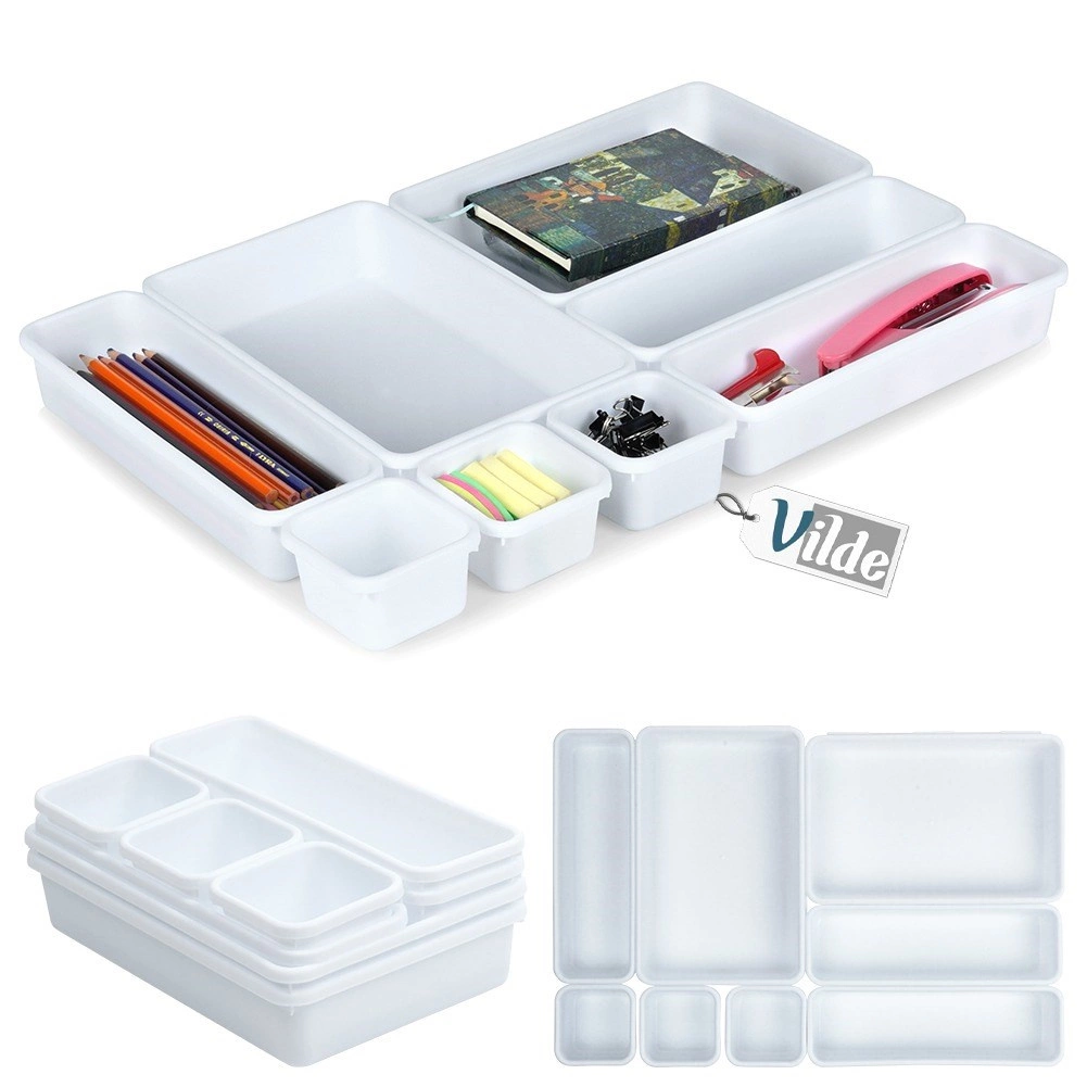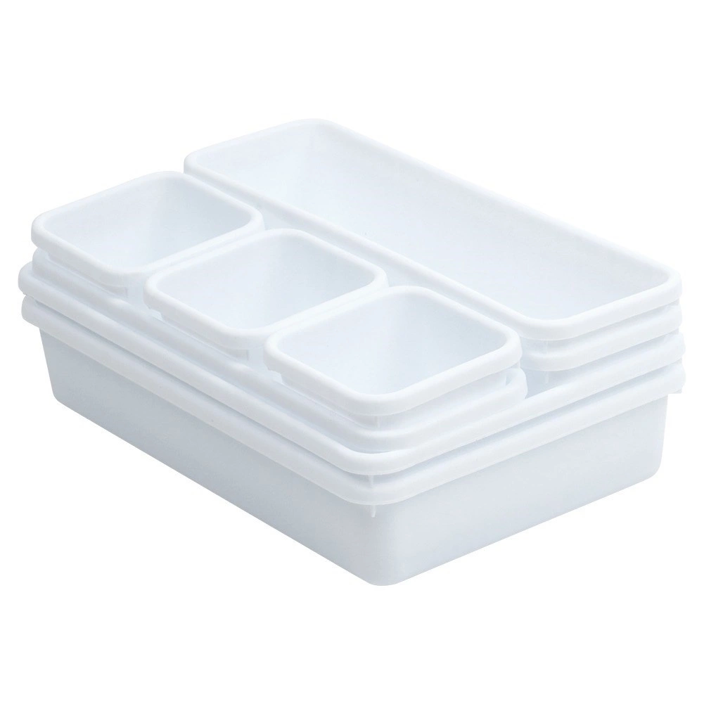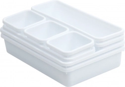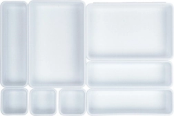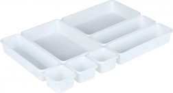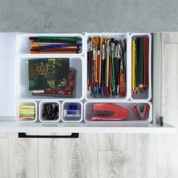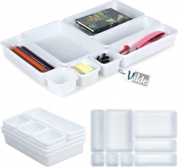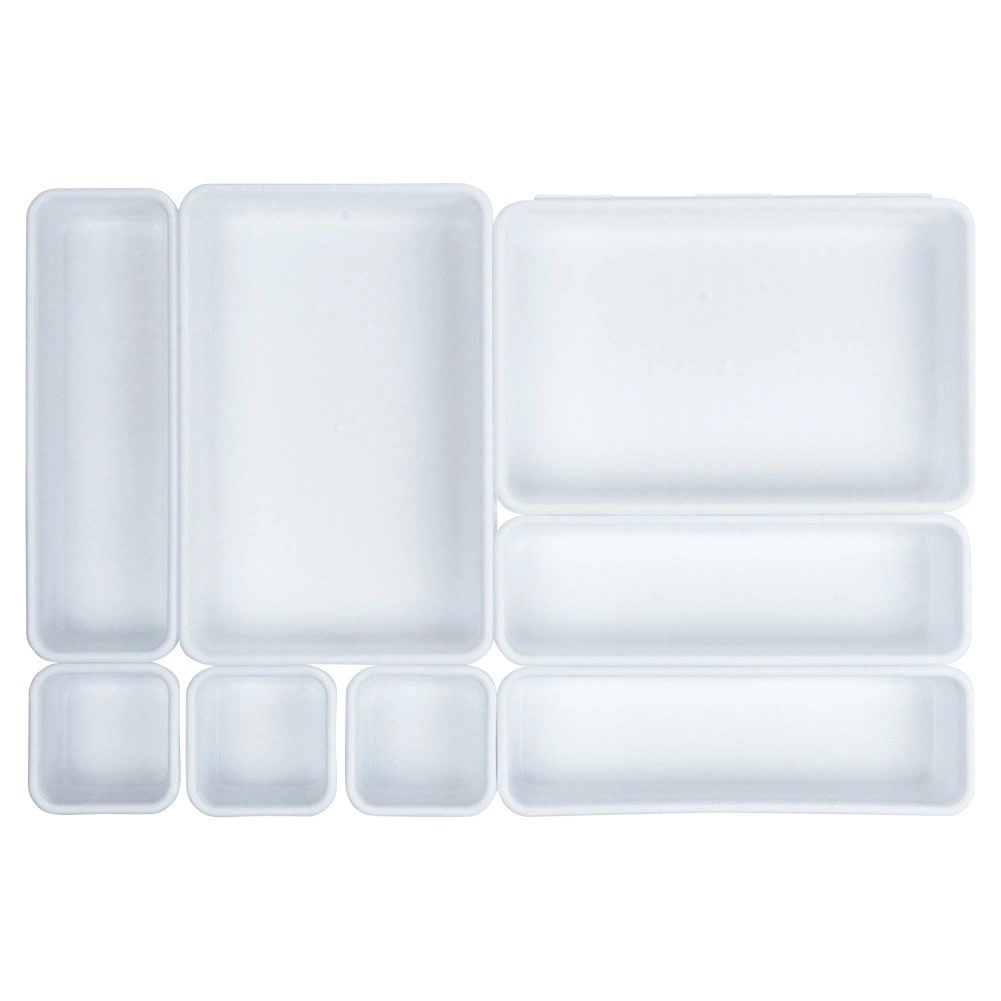 Sada 8 bílých plastových pořadačů do zásuvky pomůže udržet přehled a mít vše na dosah. Díky modulární konstrukci lze misky kombinovat a skládat do libovolného layoutu podle šířky a hloubky zásuvky. Hladký povrch se snadno čistí a zaoblené rohy usnadňují manipulaci.