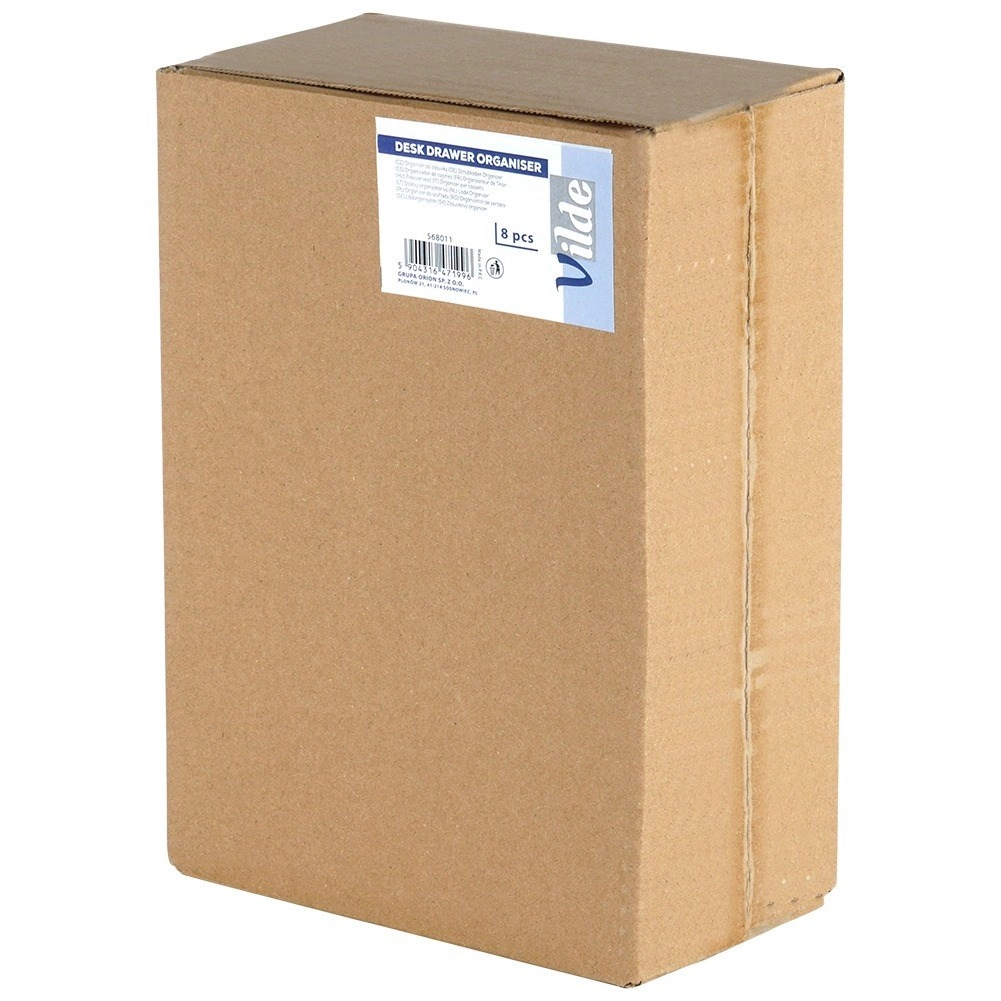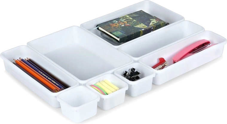 V balení najdete 2× velký (23,5 × 16 × 4,5 cm), 3× střední (23,5 × 7,5 × 4,5 cm) a 3× malý box (7,5 × 7,5 × 4,5 cm). Organizéry jsou ideální pro psací a kancelářské potřeby, kosmetiku a šperky i drobné příslušenství v domácnosti. Při nepoužívání je lze vkládat do sebe, takže nezabírají místo.