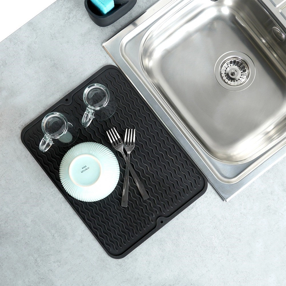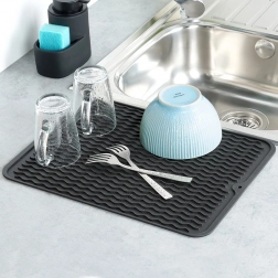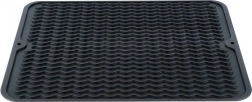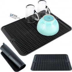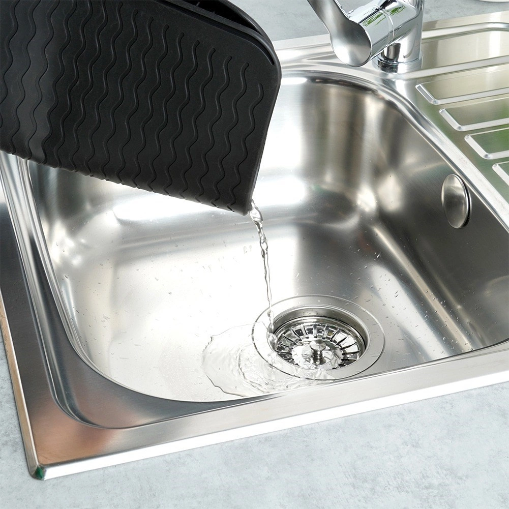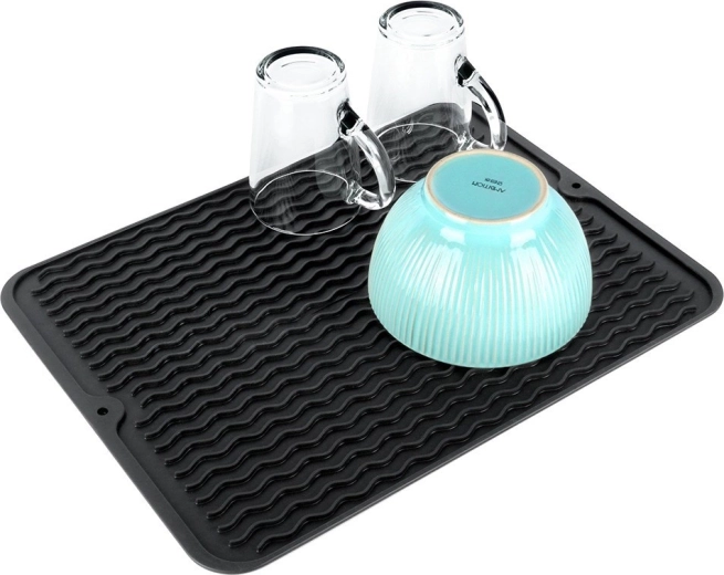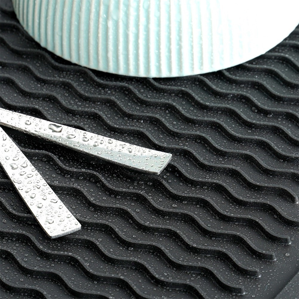 Tato černá silikonová podložka udrží vaši kuchyň čistou a organizovanou. Zvlněné drážky podporují odtok vody jedním směrem a zajišťují rychlejší schnutí sklenic, talířů i příborů. Díky flexibilnímu silikonu je podložka odolná, neklouzavá a velmi jednoduchá na čištění.