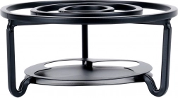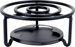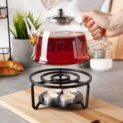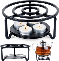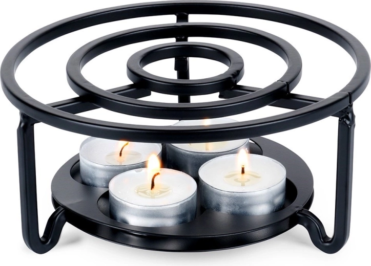 Univerzální kovový ohřívač na čajník a nádobí v elegantní černé barvě udrží vaše nápoje a pokrmy příjemně teplé po dlouhou dobu. Díky průměru 16,5 cm a výšce 8 cm je stabilní a vhodný pro různé typy nádob. Má prostor až pro 4 čajové svíčky (tealighty), pevnou kovovou konstrukci a nadčasový design, který ladí s každou jídelní soupravou.