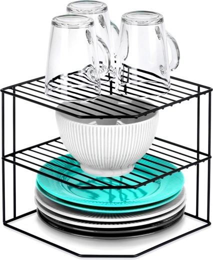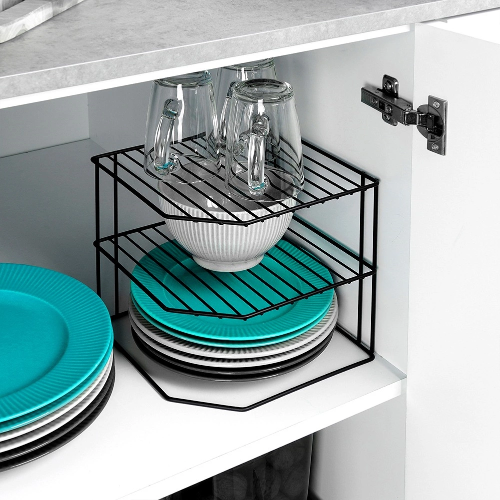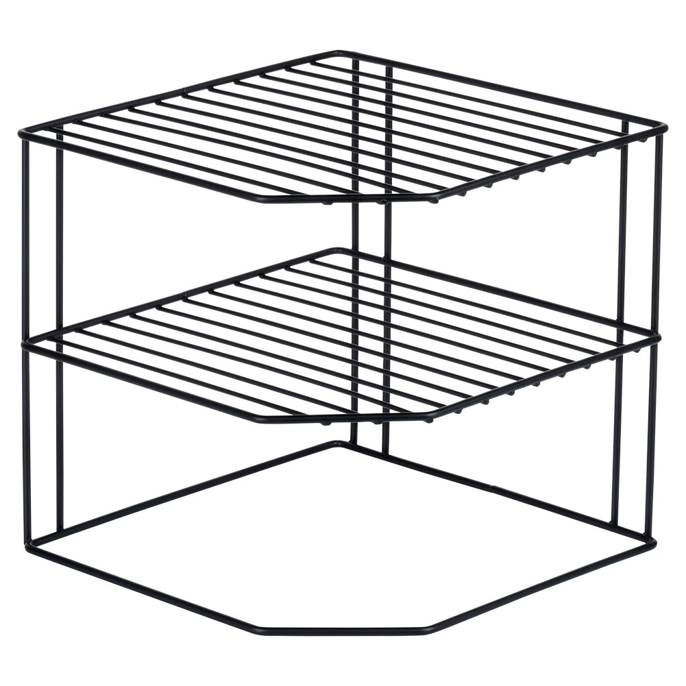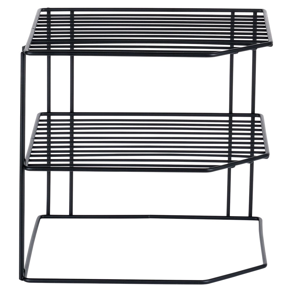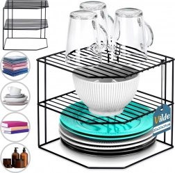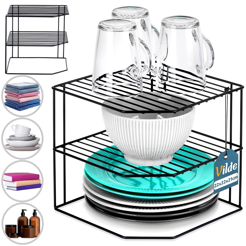 Tato rohová kuchyňská police s rozměry 22 × 22 × 21 cm efektivně rozdělí prostor skříňky na tři patra, takže lépe uložíte talíře, misky, sklenice i potraviny. Otevřená drátěná konstrukce zajišťuje vzdušnost a přehled, zatímco práškové lakování v černé barvě dodává elegantní vzhled a odolnost proti oděru.