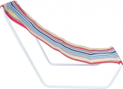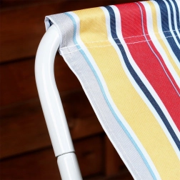Bílý kovový rám je pevný a stabilní, zatímco prodyšná polyesterová tkanina v barevných pruzích poskytuje pohodlné a příjemné sezení.