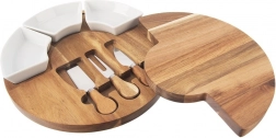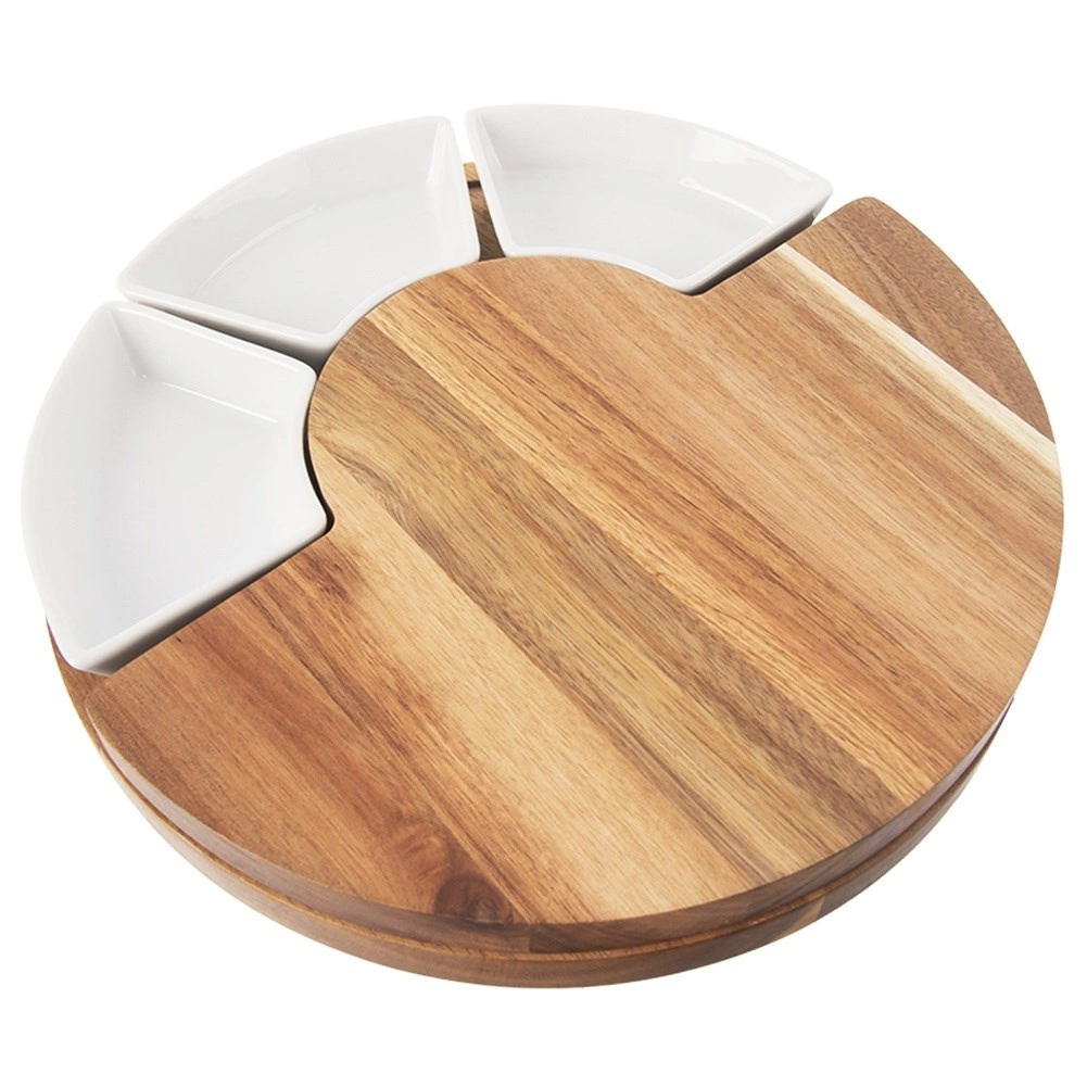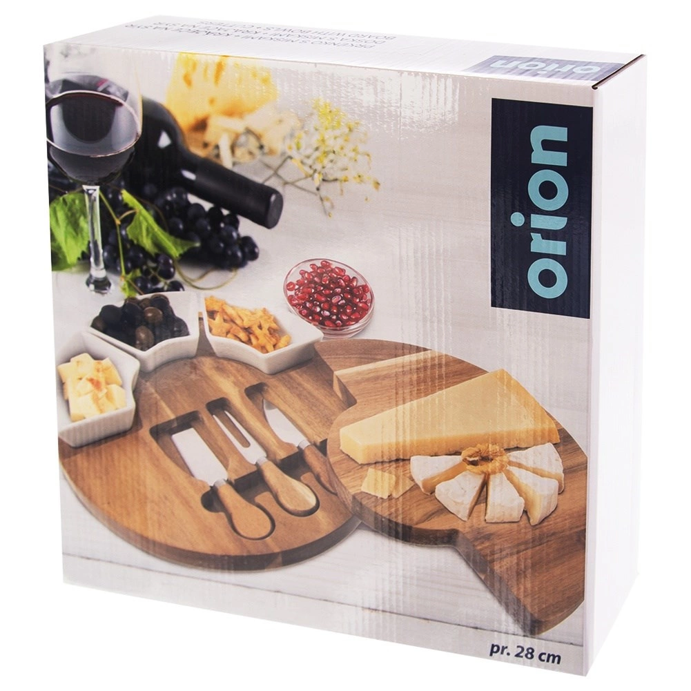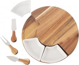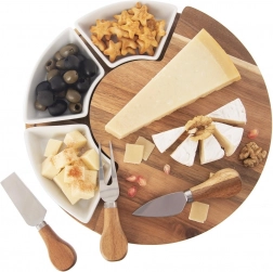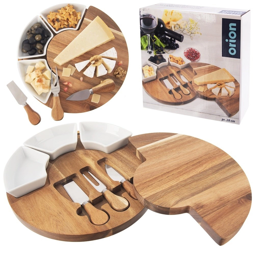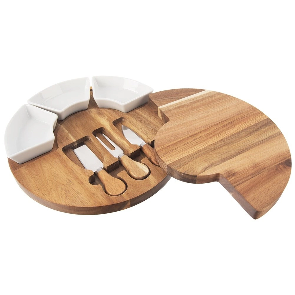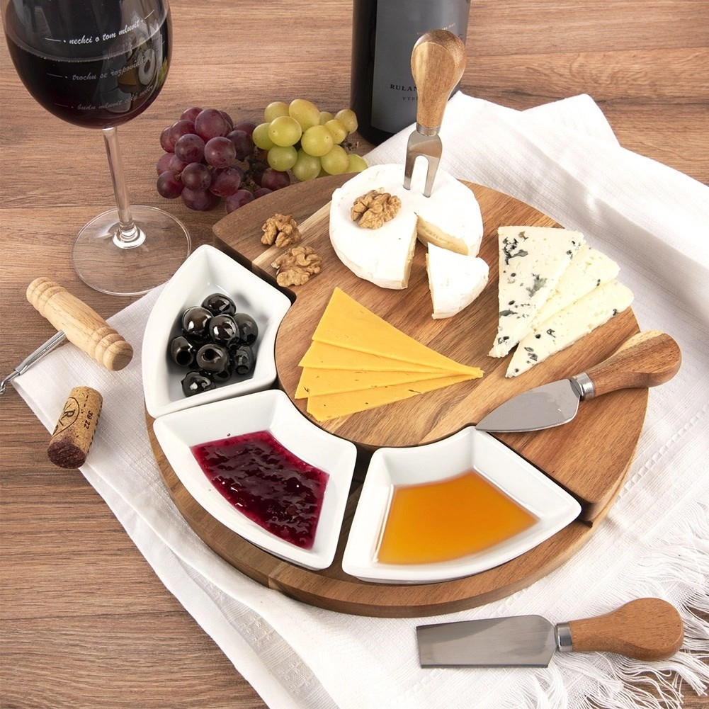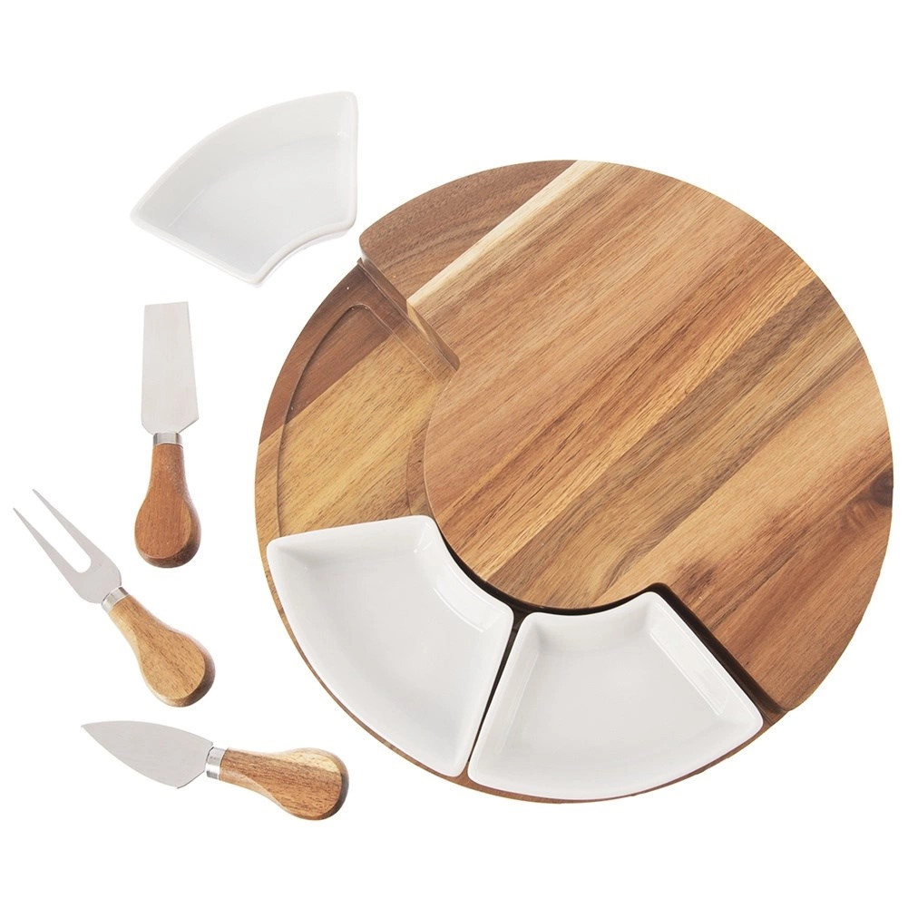 Díky třem nástrojům (nožík, lopatka a vidlička) zvládnete měkké, polotvrdé i tvrdé sýry. Tři keramické misky poslouží na dipy, chutney, olivy nebo ořechy, takže vytvoříte působivé sýrové prkénko během chvilky. Přírodní akát dodává odolnost a atraktivní kresbu dřeva, keramika je hygienická a snadno se čistí.