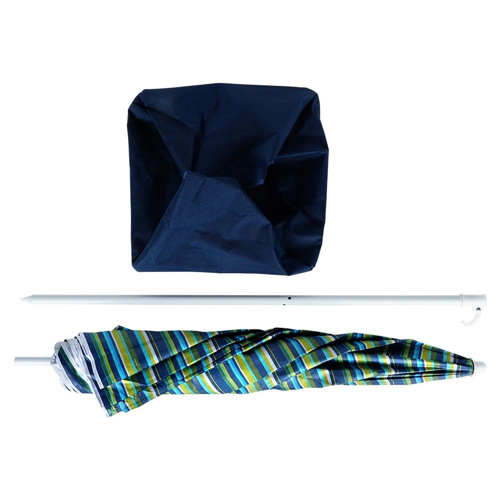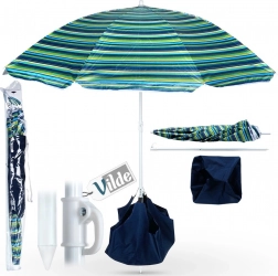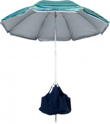Pro bezpečné ukotvení na pláži je v balení vak na písek, který po naplnění výrazně zvyšuje stabilitu i za větrného počasí. Slunečník se ručně otevírá, po složení je kompaktní a vejde se do přepravní tašky s popruhem (délka složeného setu cca 100 cm) – ideální na dovolenou, k vodě i na terasu.