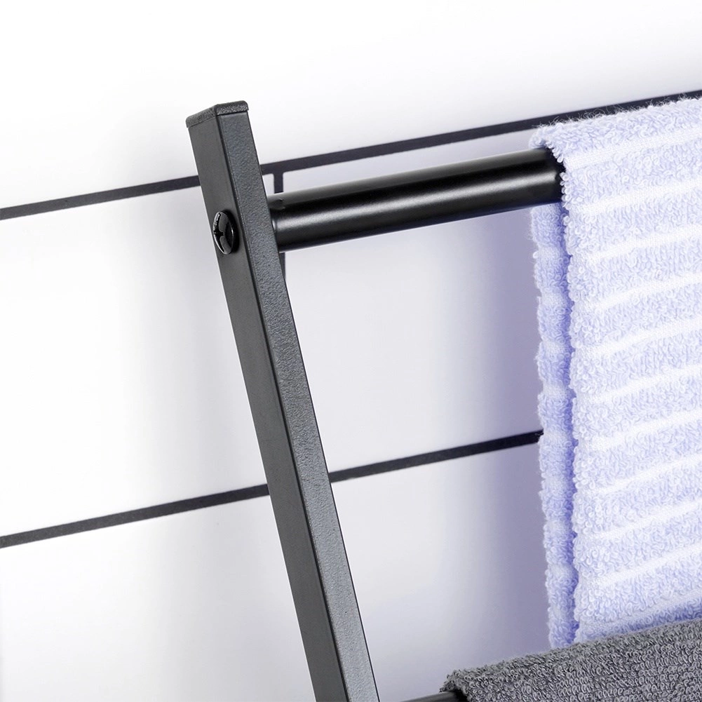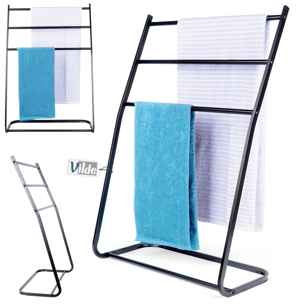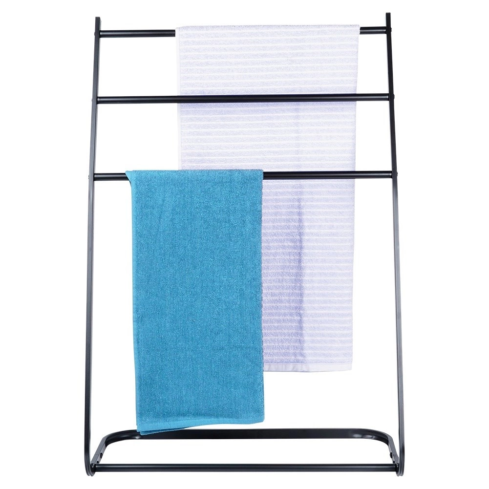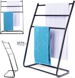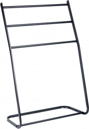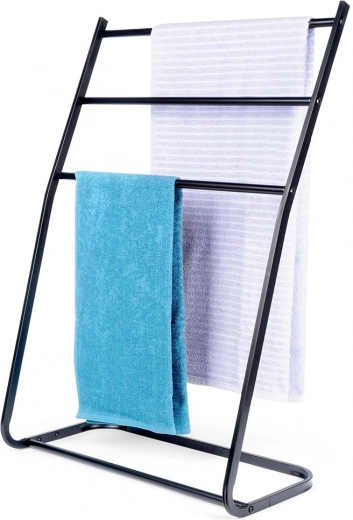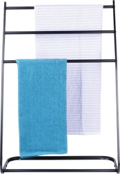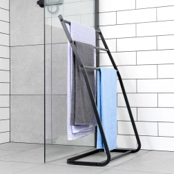 Volně stojící kovový stojan na ručníky či oblečení nabízí tři pevné příčky v různých úrovních pro optimální proudění vzduchu a rychlejší sušení. Minimalistický design v černé barvě působí čistě a nadčasově, takže se skvěle hodí do koupelen v moderním i klasickém stylu.
