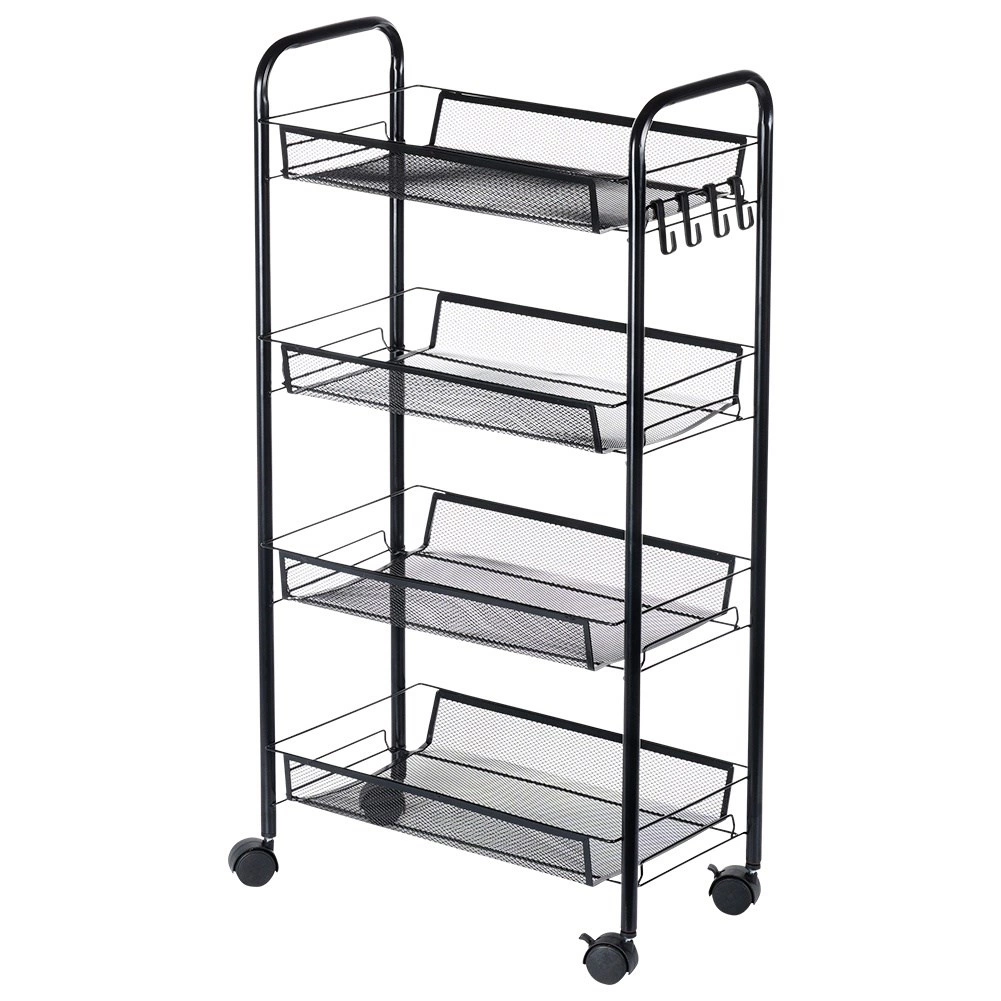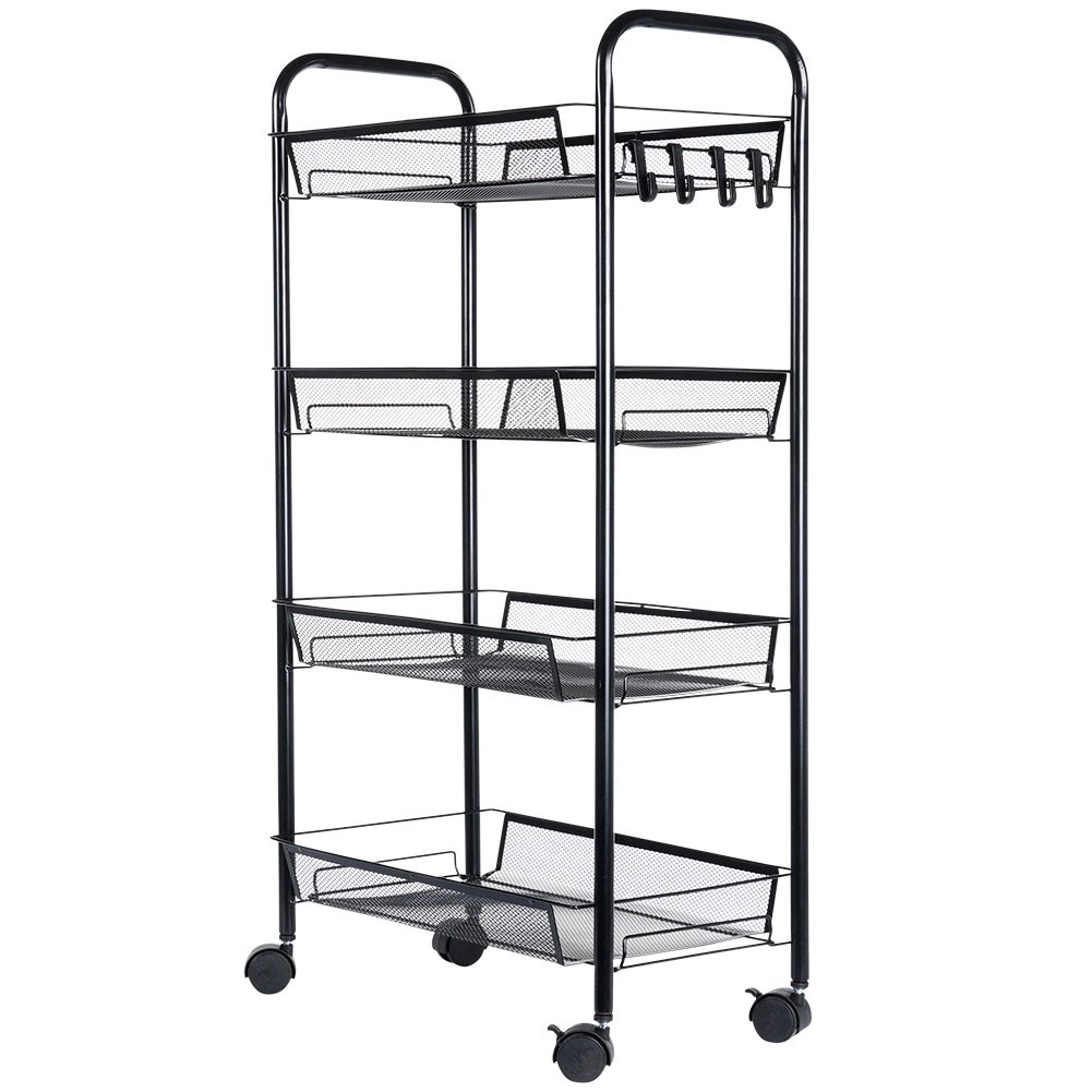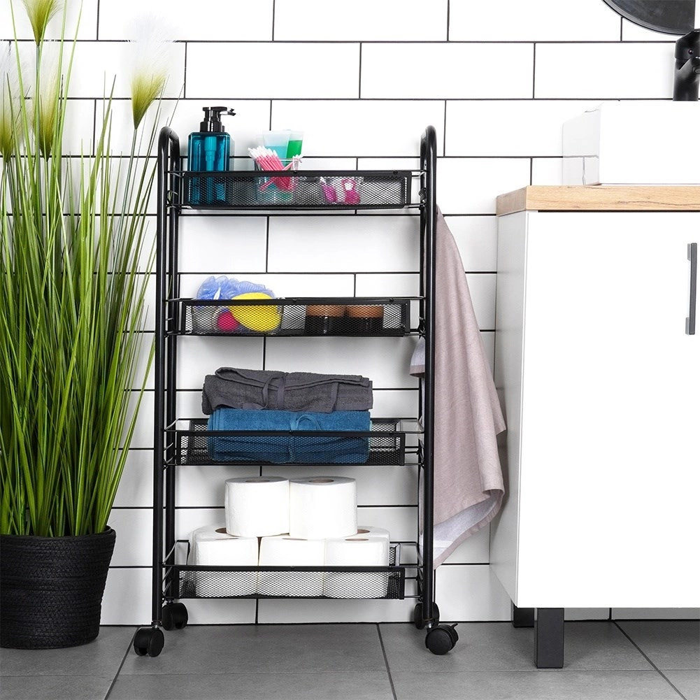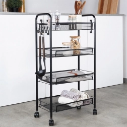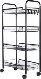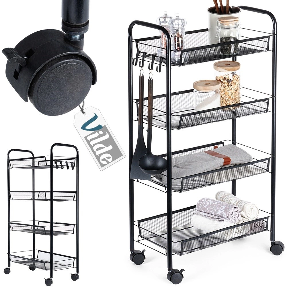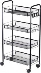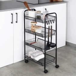 Úzký a skladný pomocník pro každodenní pořádek. Kovový regál s 4 košíky efektivně využije vertikální prostor, takže i na malé ploše uložíte potraviny, kosmetiku, čisticí prostředky, ručníky či kancelářské potřeby. Díky otočným kolečkům jej snadno přesunete tam, kde je zrovna potřeba, a dvě aretace zajistí stabilní stání.