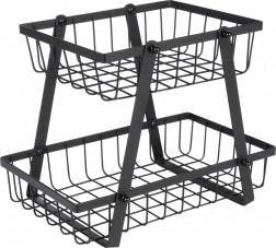 Celkový rozměr sestavy je 28 × 17,5 × 21 cm. Spodní koš má 28 × 17 × 6 cm, horní 21,5 × 17 × 6 cm. Matně černý kov dodává odolnost a stabilitu, praktické úchyty usnadňují přenášení. Košík se skvěle hodí i pro kosmetiku, toaletní potřeby, kancelářské drobnosti nebo pečivo.