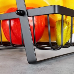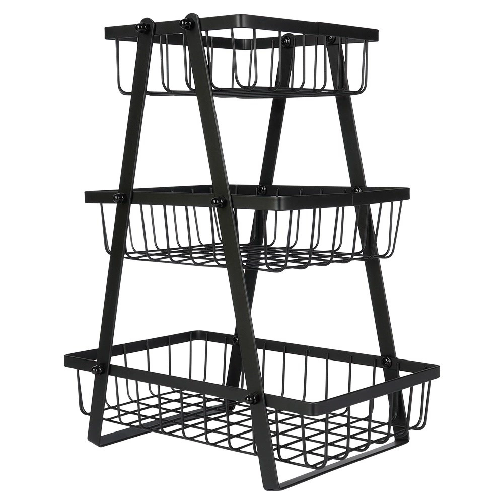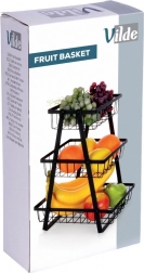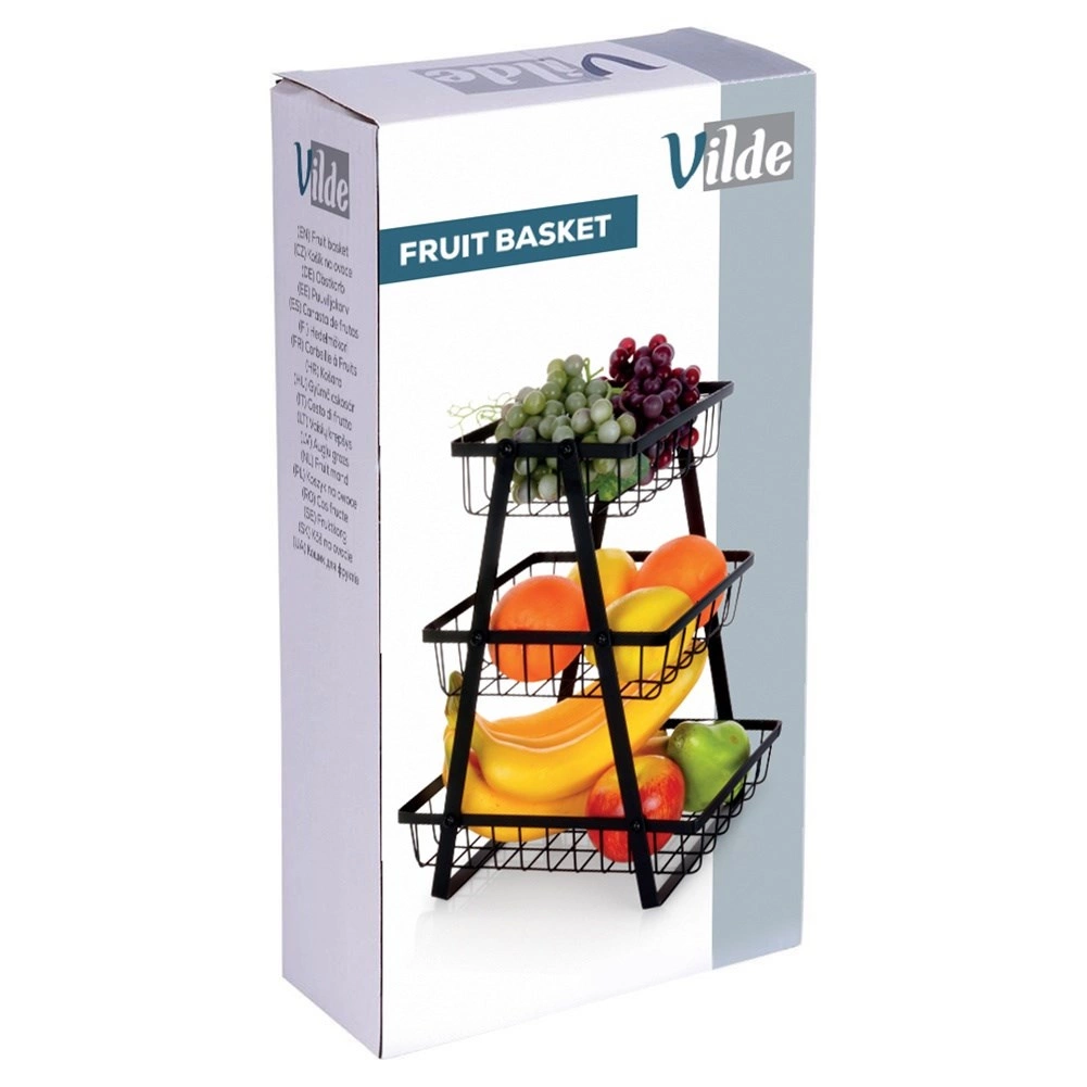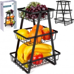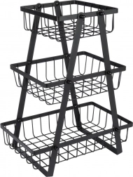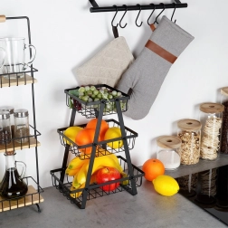 Praktický a elegantní třípatrový koš na ovoce a zeleninu v matné černé barvě. Díky kovové konstrukci, otevřenému drátěnému designu a třem prostorným košům udrží vaši kuchyň přehlednou, šetří místo na pracovní desce a zajišťuje optimální cirkulaci vzduchu pro delší čerstvost potravin.