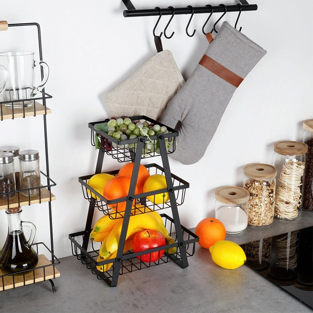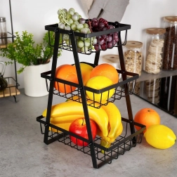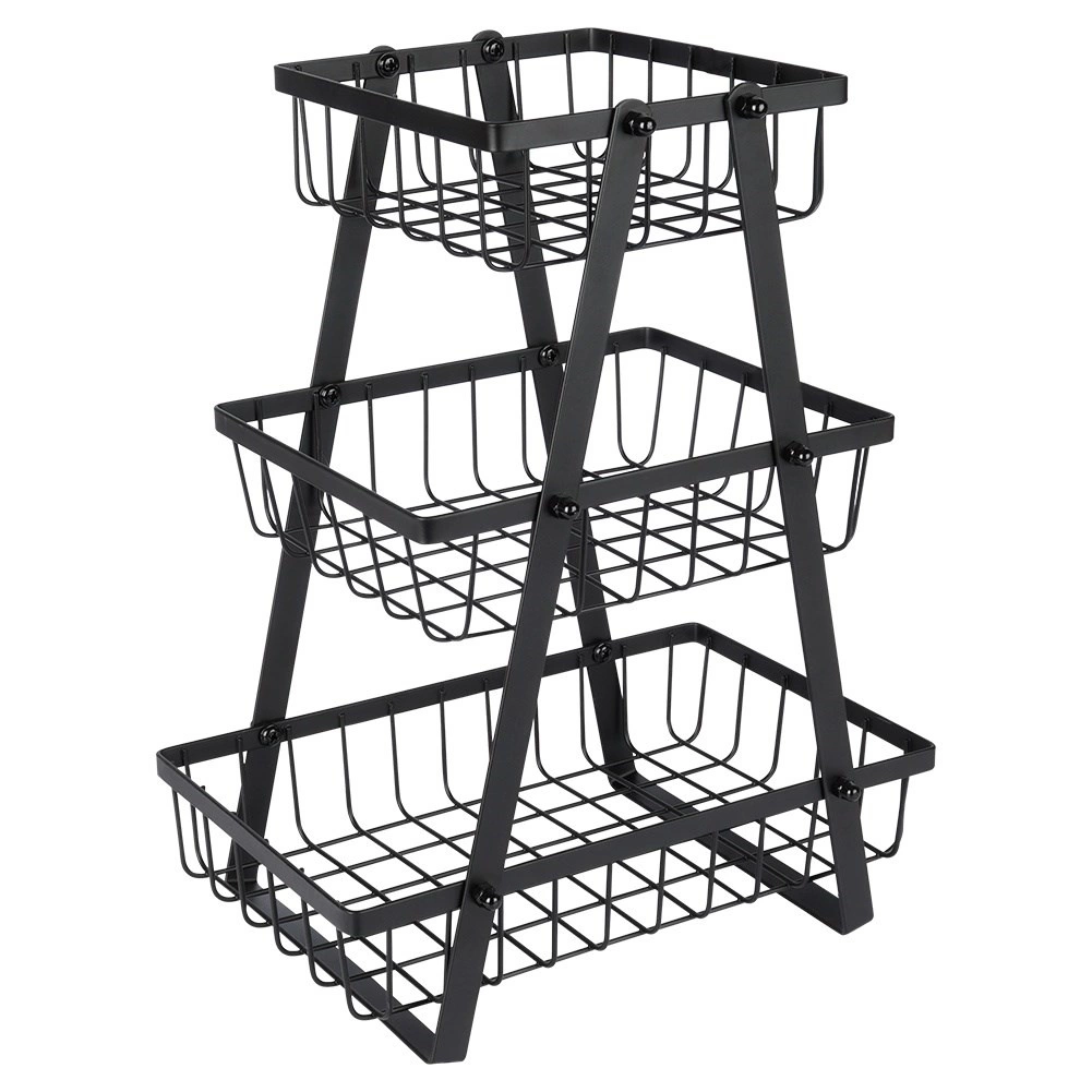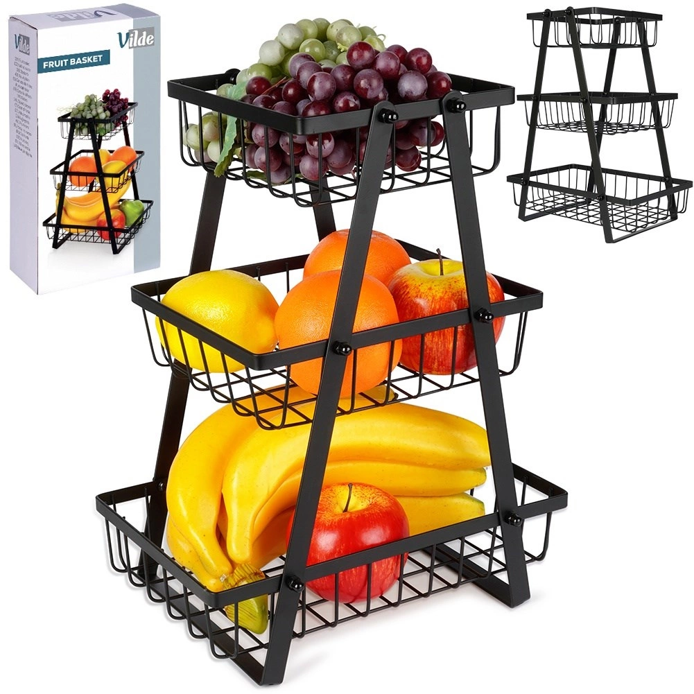 Tento tříúrovňový stojan na ovoce je ideálním řešením pro organizované a stylové uložení ovoce, zeleniny či drobností v kuchyni. Stabilní A‑rám a pevné kovové koše s otevřenými stěnami zaručují skvělý přehled a přístup k obsahu, zároveň podporují proudění vzduchu, aby potraviny déle vydržely čerstvé.