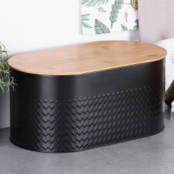 Moderní chlebník s kovovým tělem z kvalitní uhlíkové oceli lakované do matné černé barvy a působivým strukturovaným povrchem. Víko z přírodního dřeva slouží jako praktické krájecí prkénko, takže máte vždy vše po ruce – od uskladnění až po servírování.