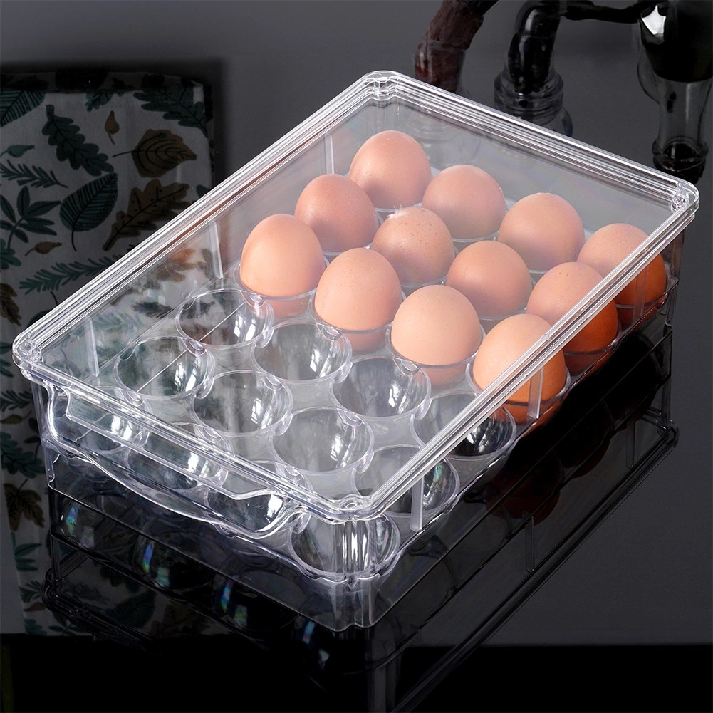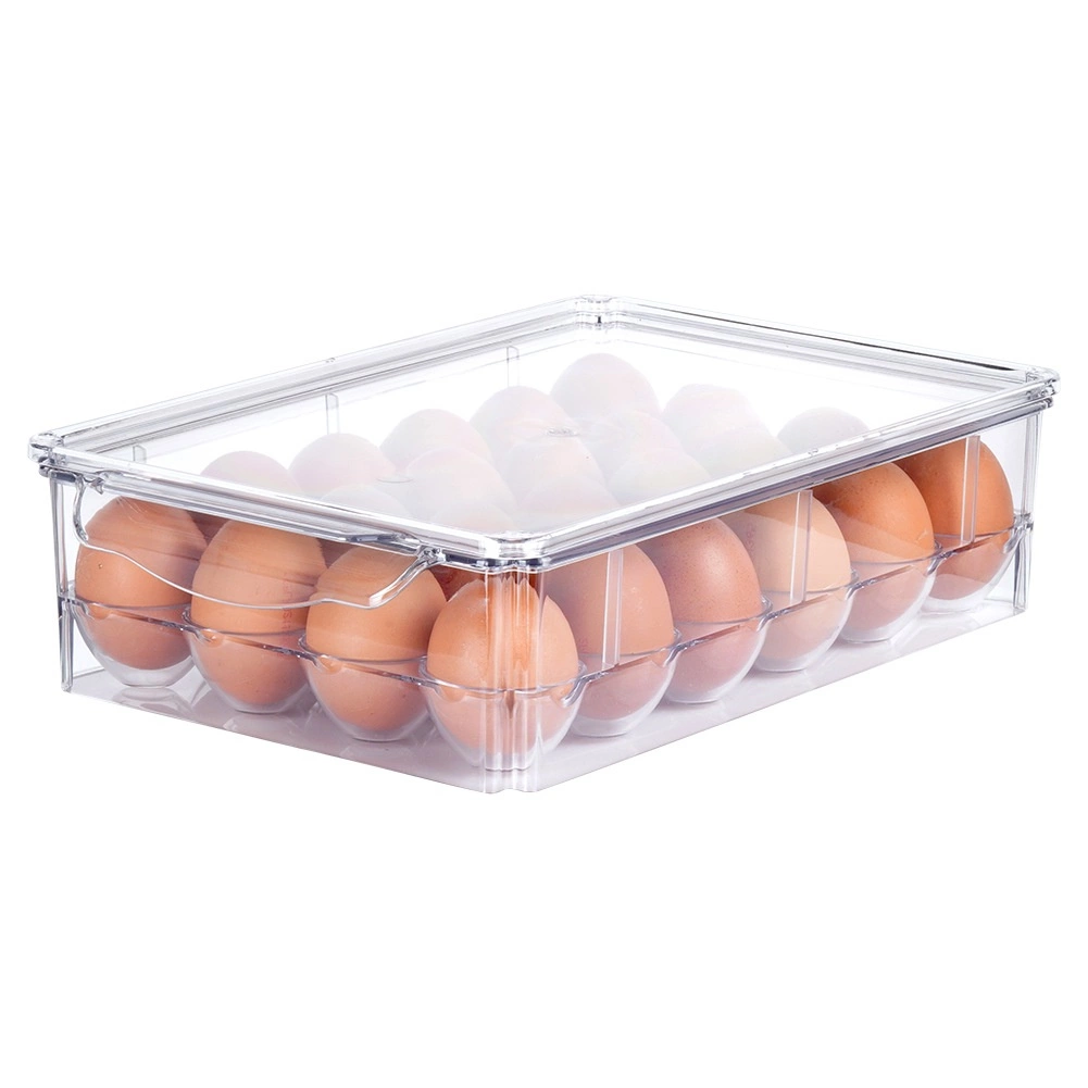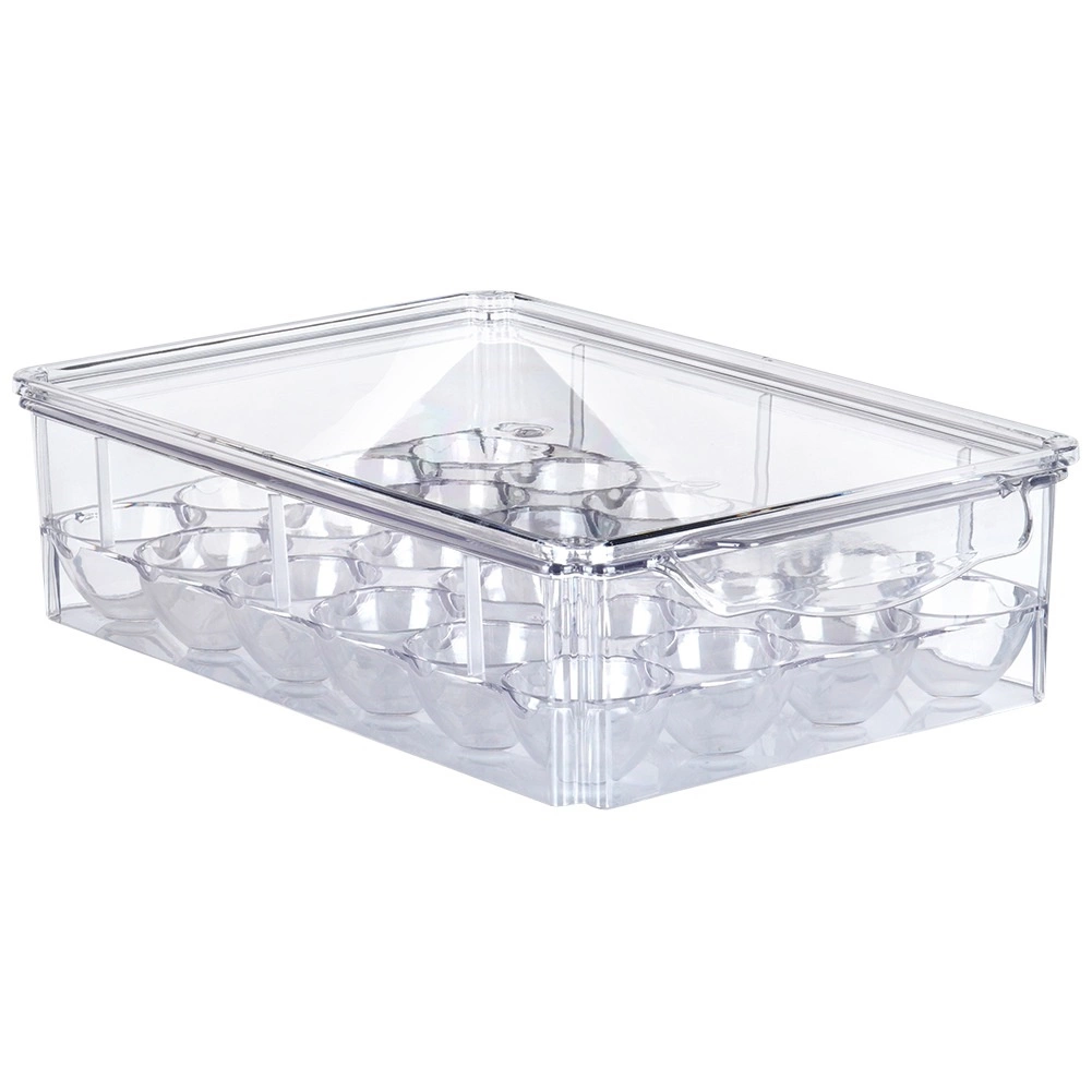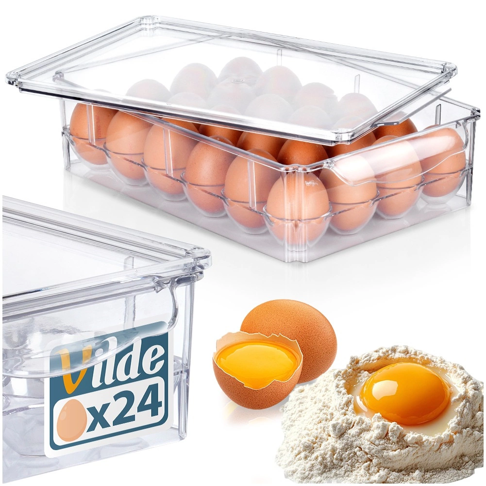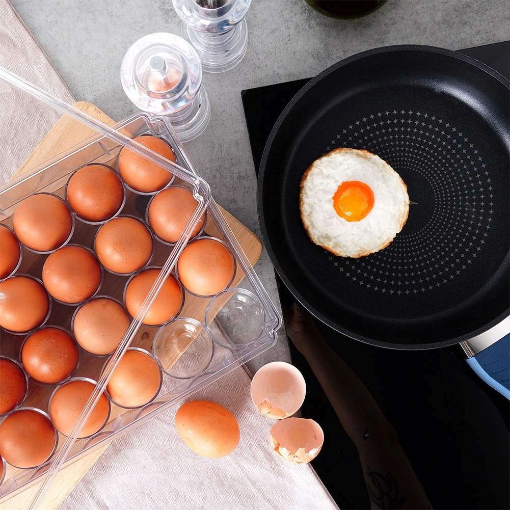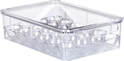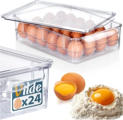 Udržte pořádek v lednici s prostorným organizérem na vejce, který pojme až 24 kusů. Odolné a zcela průhledné provedení vám umožní okamžitou vizuální kontrolu zásob, zatímco tvarované lůžka bezpečně fixují každé vejce. Praktické víko chrání před cizími pachy a vlhkostí a umožňuje pohodlné stohování více boxů nad sebe.