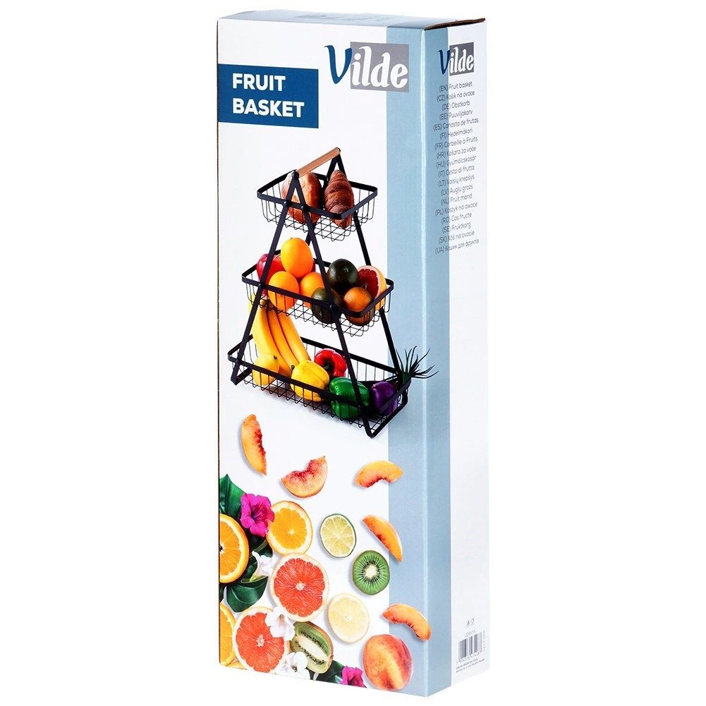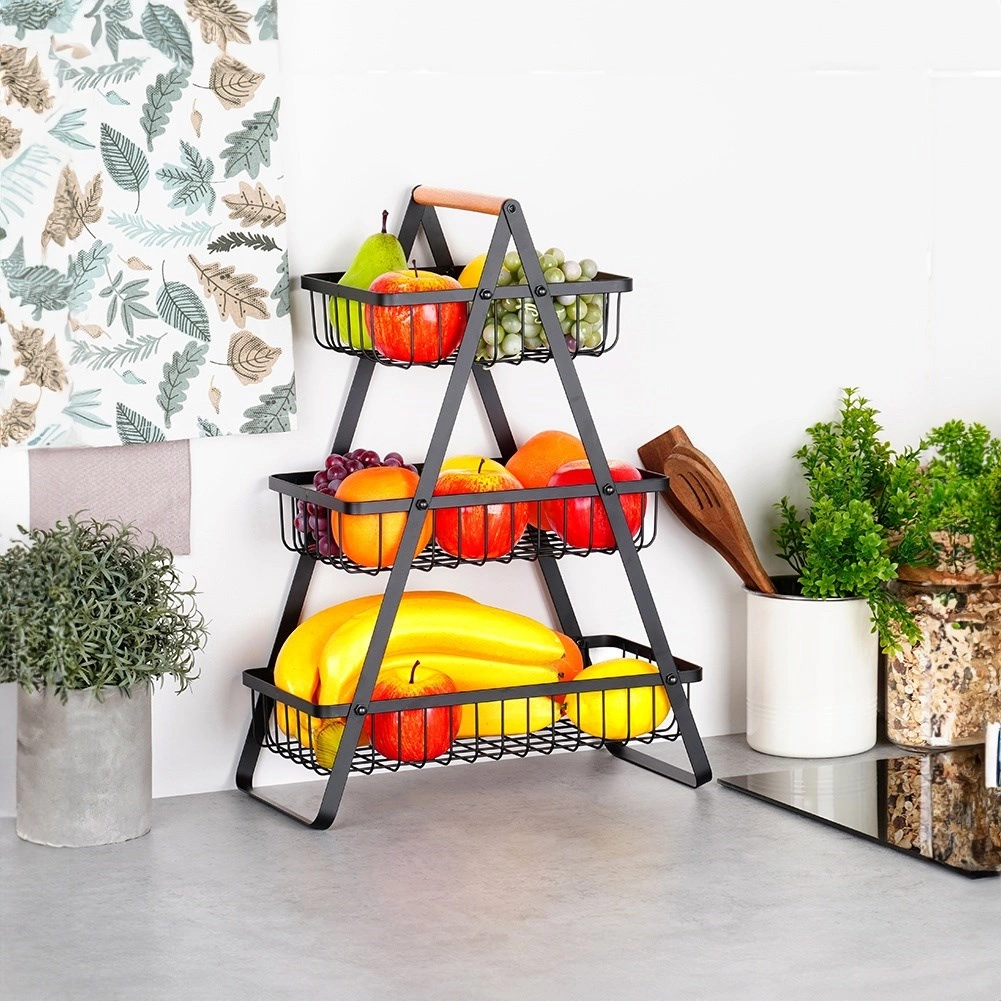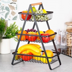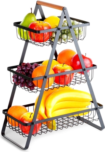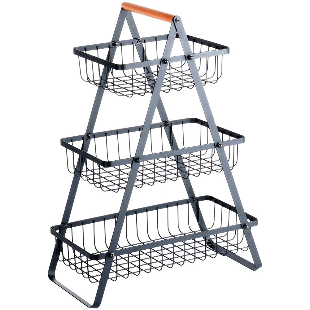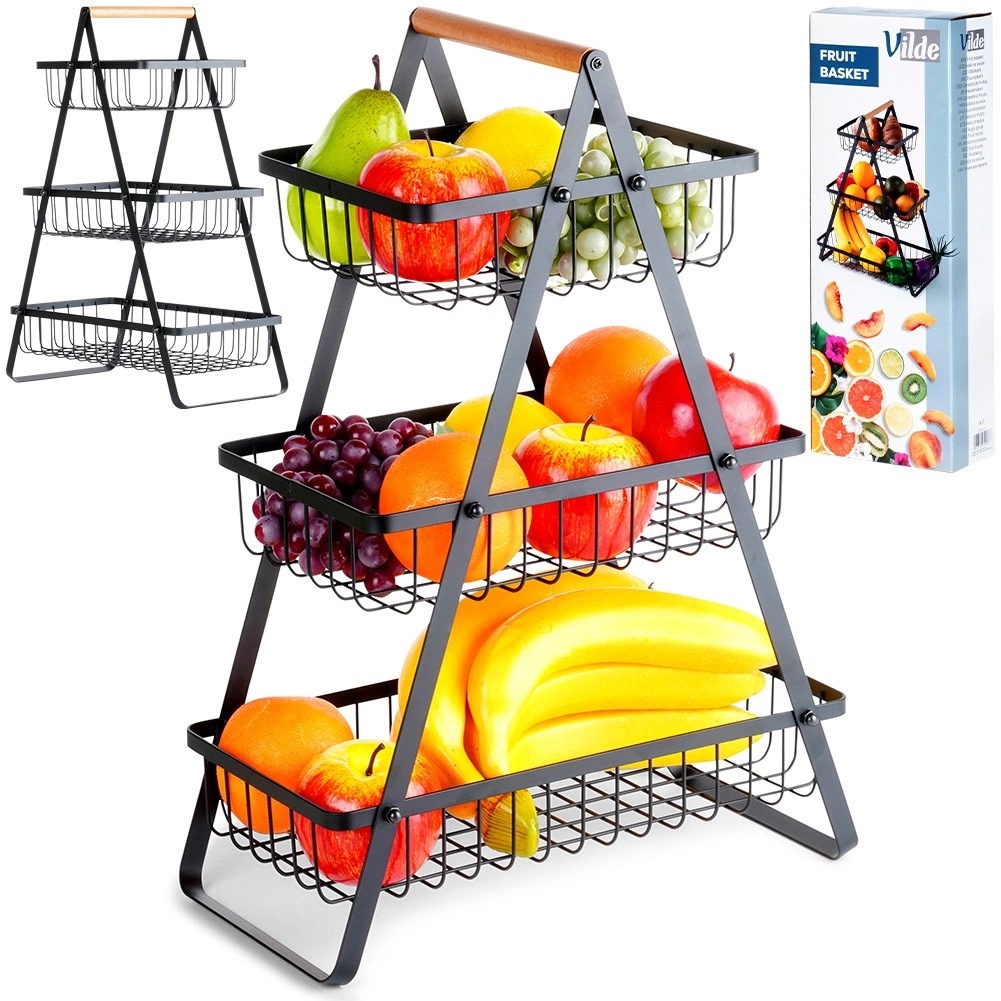 Praktický a stylový třípatrový koš na ovoce a zeleninu v matné černé barvě s dřevěným madlem. Nabízí velkou kapacitu, úsporu místa na pracovní desce a výborné proudění vzduchu díky otevřeným drátěným stěnám, které pomáhají udržet potraviny déle čerstvé.