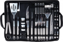 Obsah sady: 1× obracečka (35 cm), 1× kleště (34,5 cm), 1× vidlička (35 cm), 1× nůž (32 cm), 1× mašlovač se silikonovými štětinami (34 cm), 8× špíz (35 cm), 1× solnička (3,5 × 5,5 cm), 1× pepřenka (3,5 × 5,5 cm), 1× kartáč na gril se škrabkou (34 cm) + 1× náhradní hlavice, 8× držák na kukuřici (7 cm), 4× příborové vidličky (21 cm), 4× příborové nože (24 cm), 1× pouzdro.