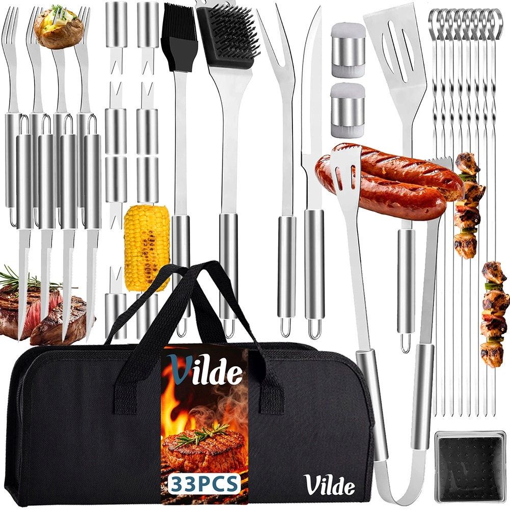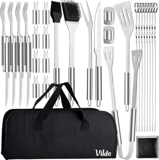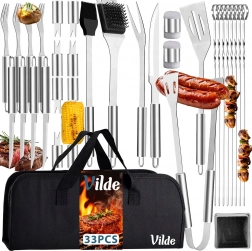 Tato univerzální sada grilovacího náčiní nabízí 33 pečlivě vybraných dílů z nerezové oceli pro každodenní grilování doma i na cestách. Dlouhé rukojeti s očkem na zavěšení zajišťují bezpečný odstup od žáru a pohodlnou manipulaci. Praktické textilní pouzdro s pevnými uchy usnadní skladování i přenášení, takže máte vše vždy po ruce a přehledně uspořádané.