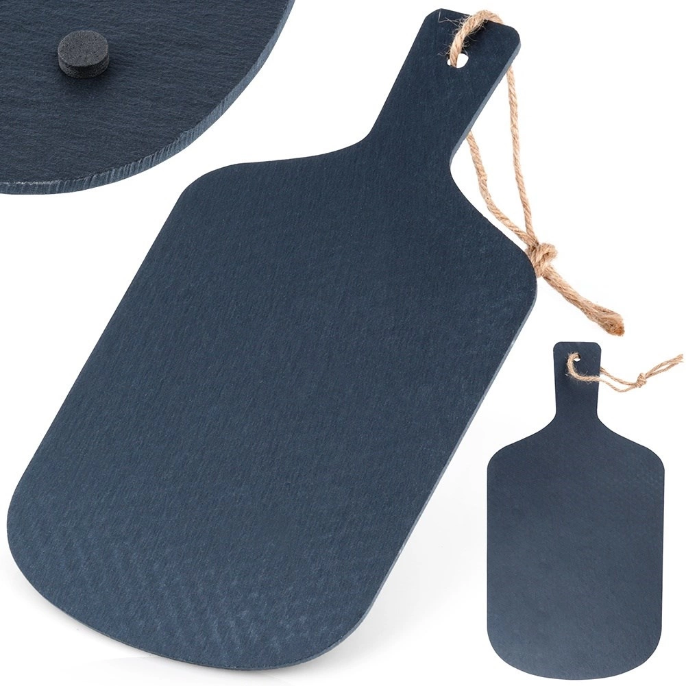Elegantní servírovací prkénko z přírodního břidlicového kamene v černé barvě s praktickou rukojetí a závěsným provázkem. Ideální pro sýry, uzeniny, dezerty i předkrmy, s protiskluzovými podložkami pro stabilitu. Využijete jej i jako stylovou podložku pod nádobí.